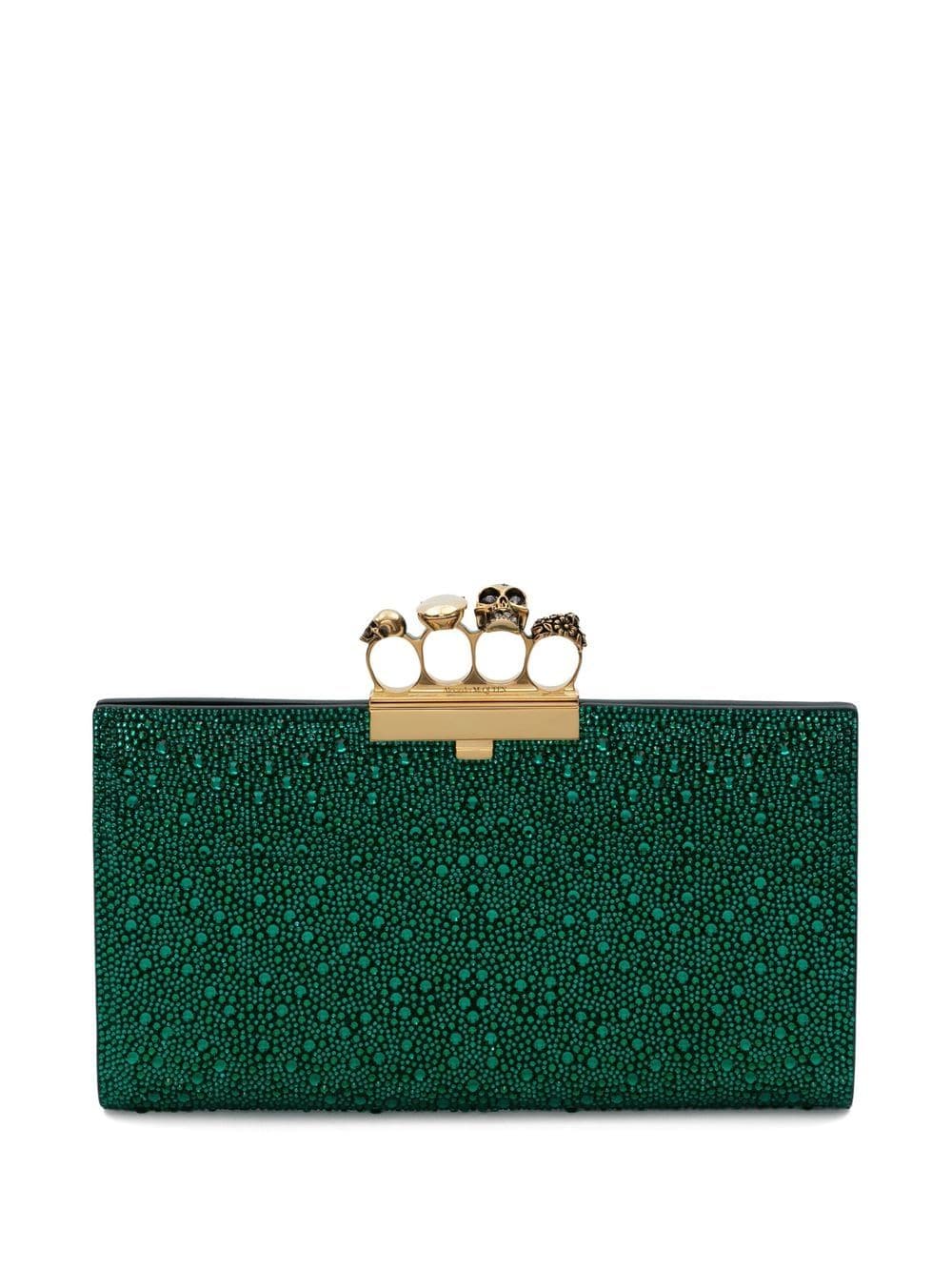 crystal-embellished knuckleduster clutch bag from Alexander McQueen featuring emerald green, calf leather, crystal embellishment, knuckleduster design, knuckleduster design and internal zip-fastening pocket.