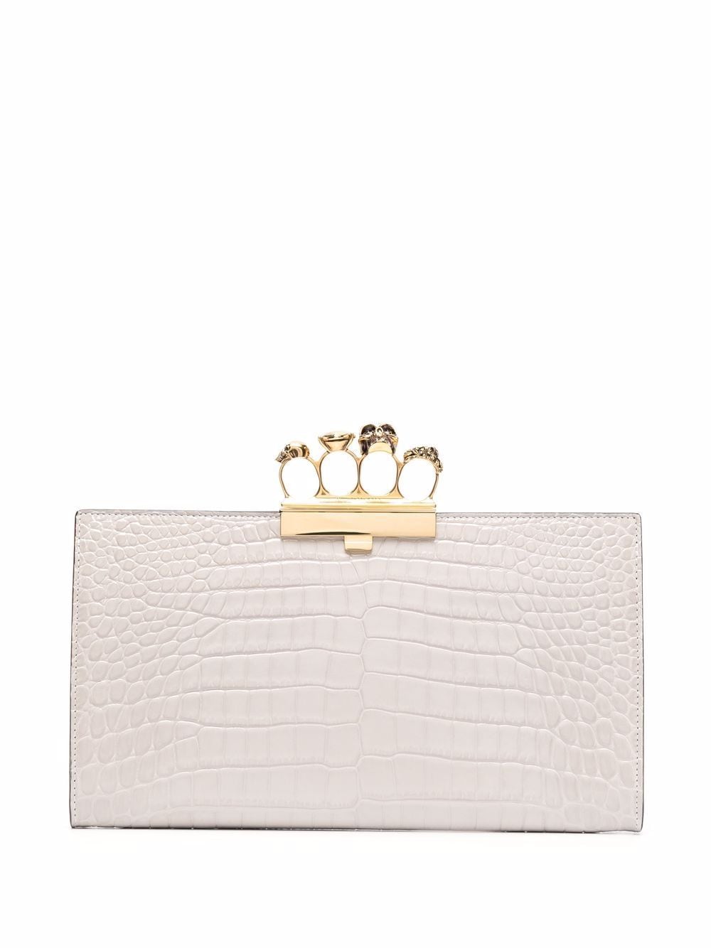 Alexander McQueen’s distinctly gothic design style is showcased in an innovative way on this clutch bag through signature Four-Ring detailing at the top. In gold-tone hardware with crystal embellishment, this detail also reflects the brand’s sense of opulence.