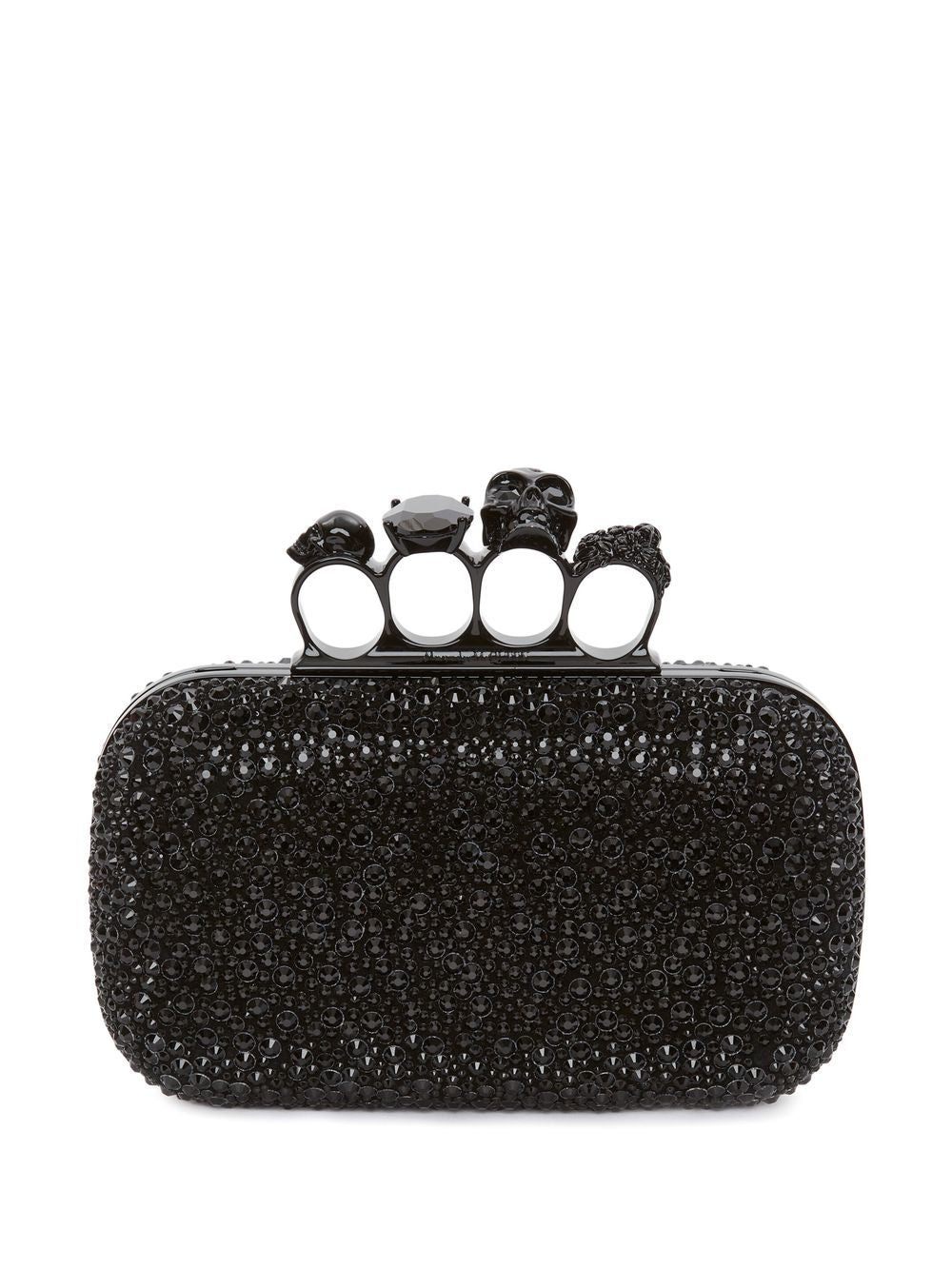 Four Ring clutch bag from Alexander McQueen featuring black, calf leather, skull stud embellishment, detachable chain-link shoulder strap, signature Four Ring handle, top clasp fastening and main compartment.