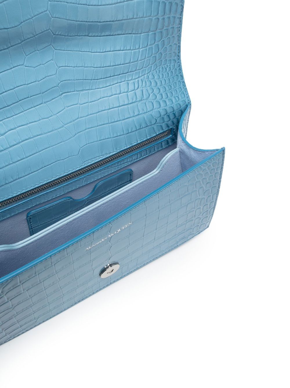 Alexander McQueen’s distinctly gothic design style is showcased in an innovative way on this crossbody bag through signature Four-Ring detailing at the front. Constructed from blue croc-embossed leather, it’s adorned with silver-tone hardware with an engraved logo which reflects the brand’s sense of opulence.