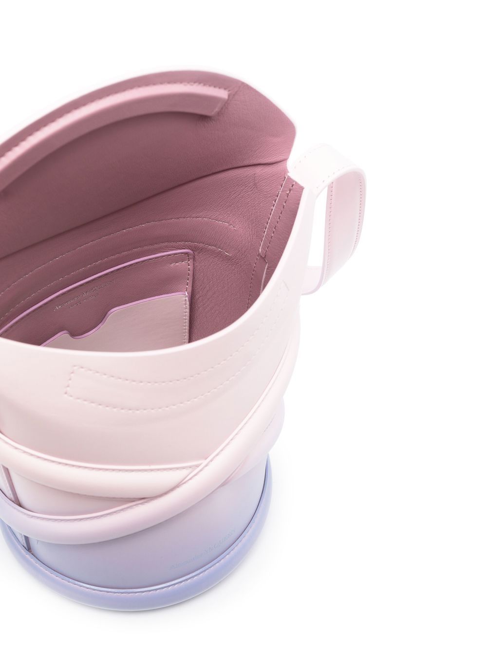 gradient-effect bucket bag from Alexander McQueen featuring light pink, light purple, calf leather, gradient effect, bucket body, crossover strap detail, debossed logo to the front, debossed logo to the rear, adjustable shoulder strap, magnetic fastening, main compartment and internal card slots.