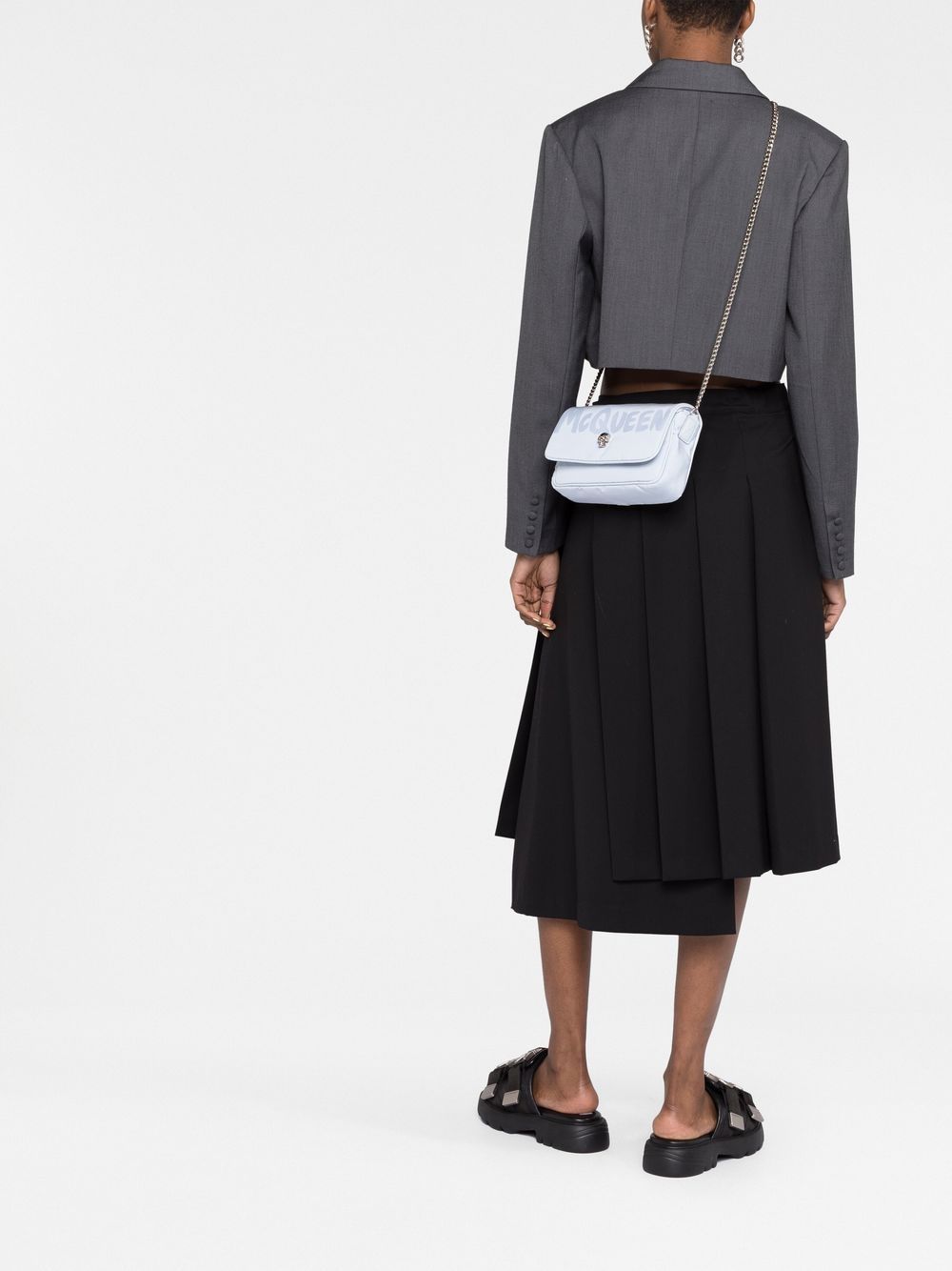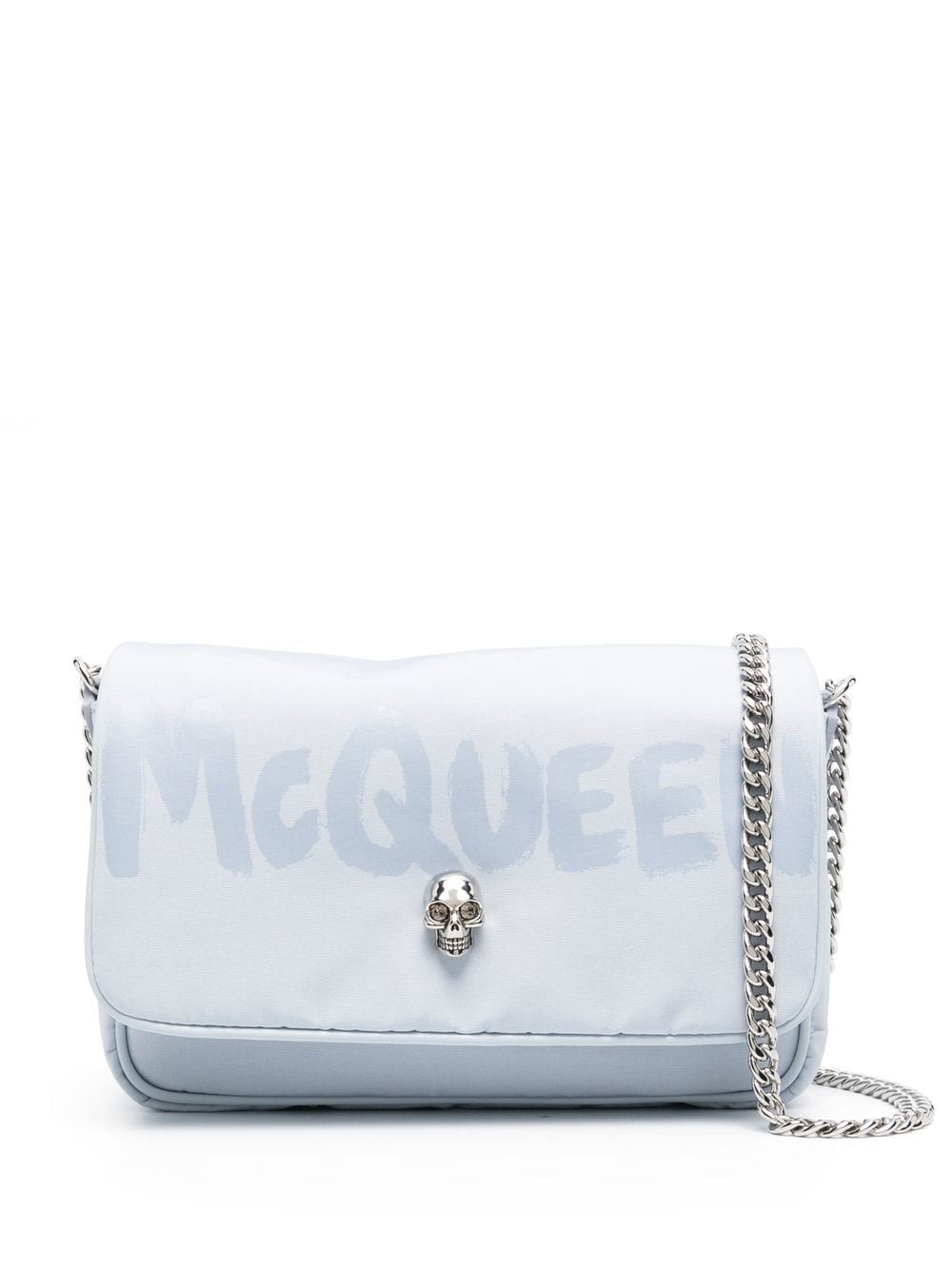 Graffiti-print skull-stud bag from Alexander McQueen featuring light blue, leather, signature Graffiti print, skull stud embellishment, chain-link shoulder strap, foldover top with magnetic fastening and main compartment.
