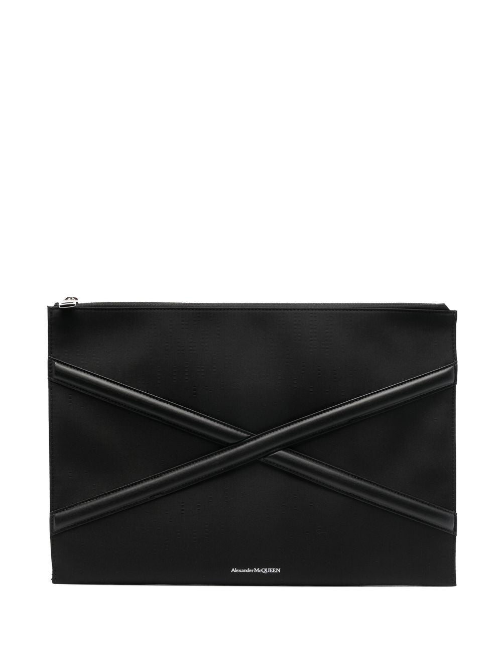 Harness logo-print clutch bag from Alexander McQueen featuring black, lambskin, leather trim, logo print to the front, top zip fastening, main compartment, internal card slots and full lining.