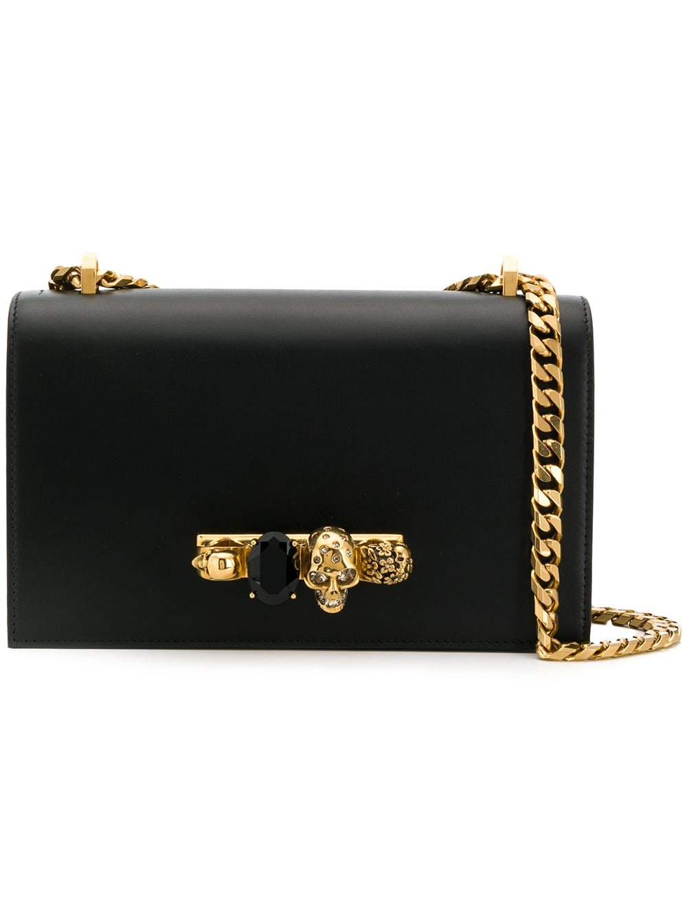 Alexander McQueen is renowned for being the champion of eye-popping theatrics, toughening up everyday accessories with gothic romanticism. This black leather Jewelled shoulder bag from Alexander McQueen features a chain and leather strap, a foldover top with magnetic closure, an internal zipped pocket, an internal logo stamp and a gold-toned four ring adornment encrusted with Swarovski crystals to the front.