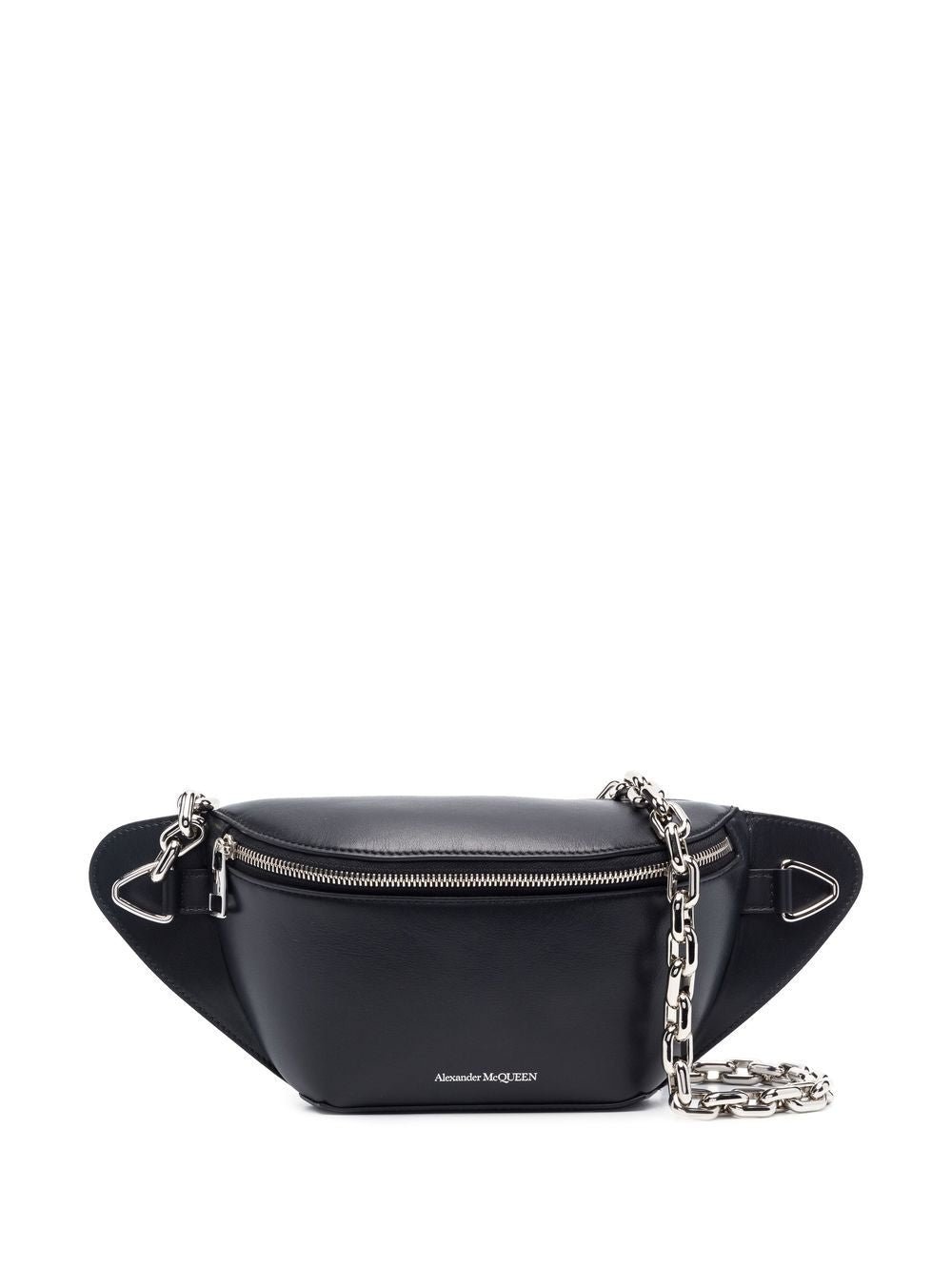 logo-embossed leather belt bag from Alexander McQueen featuring black, calf leather, embossed logo to the front, top zip fastening, main compartment and adjustable shoulder strap.