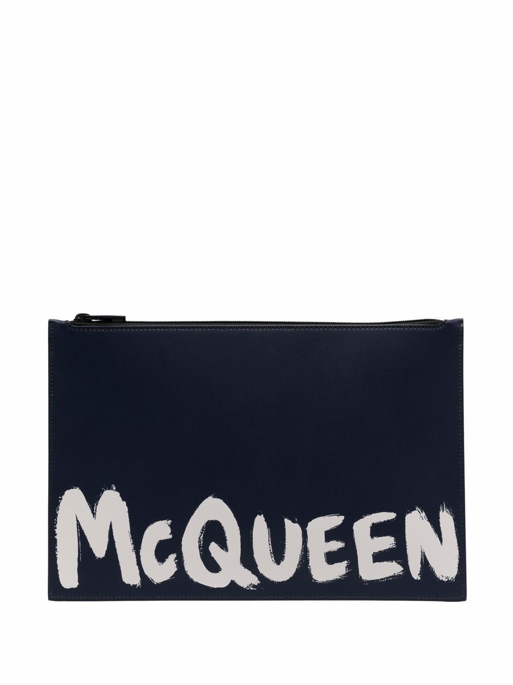 Dark blue leather logo-print clutch bag from Alexander McQueen featuring logo print to the side, top zip fastening and main compartment.