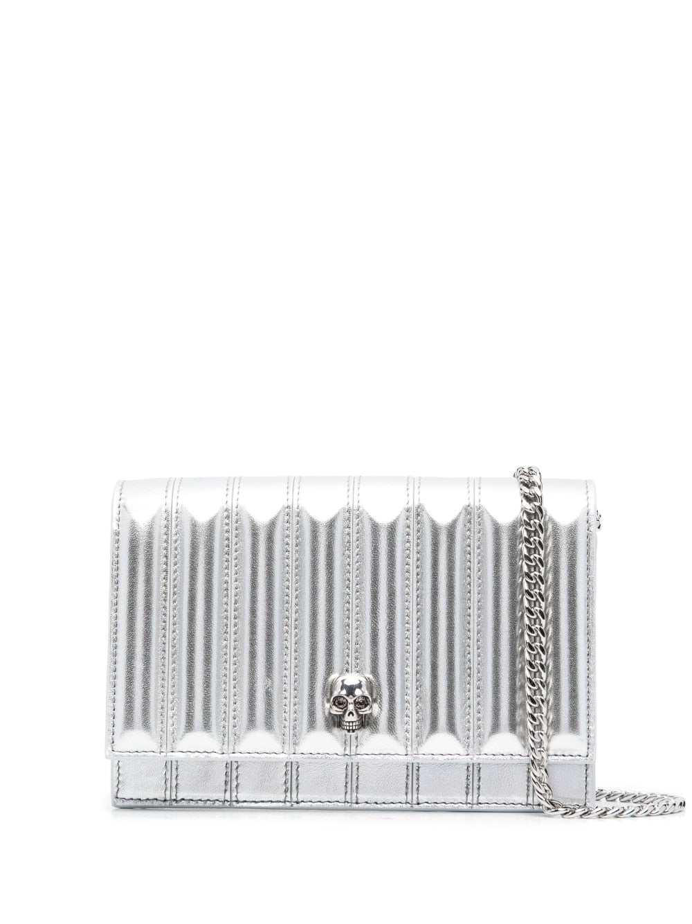 metallic-effect skull crossbody bag from Alexander McQueen featuring silver-tone, calf leather, leather lining, silver-tone hardware, metallic effect, foldover top with press-stud fastening, chain-link shoulder strap, main compartment and internal slip pocket.