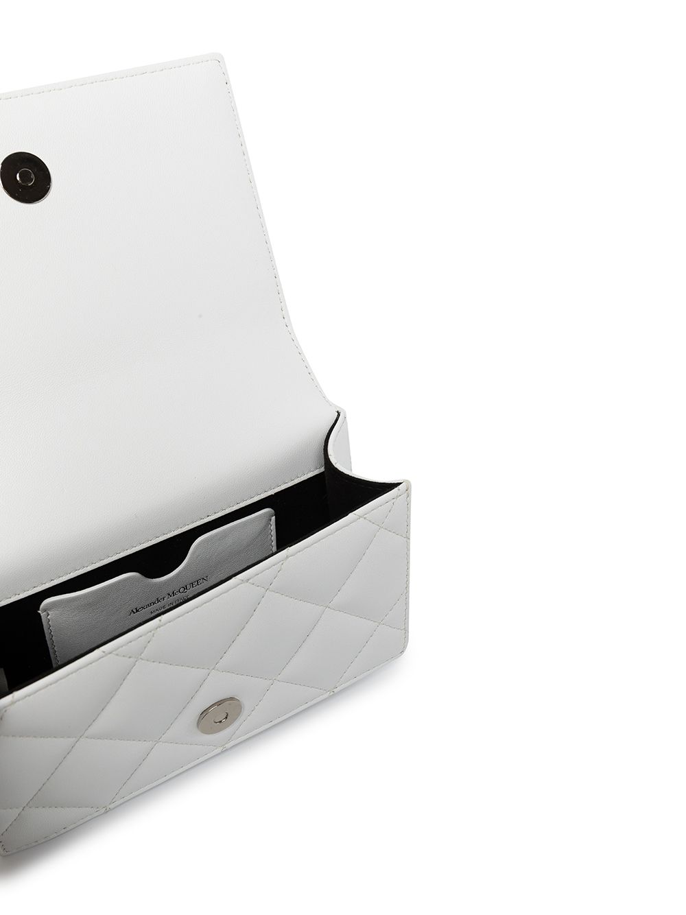 White leather mini jewelled satchel from Alexander McQueen featuring logo print to the front, quilted, leather and chain-link shoulder strap, foldover top with magnetic fastening, main compartment, internal card slot and silver-tone four-ring embellishment. This piece comes complete with a protective dust bag..