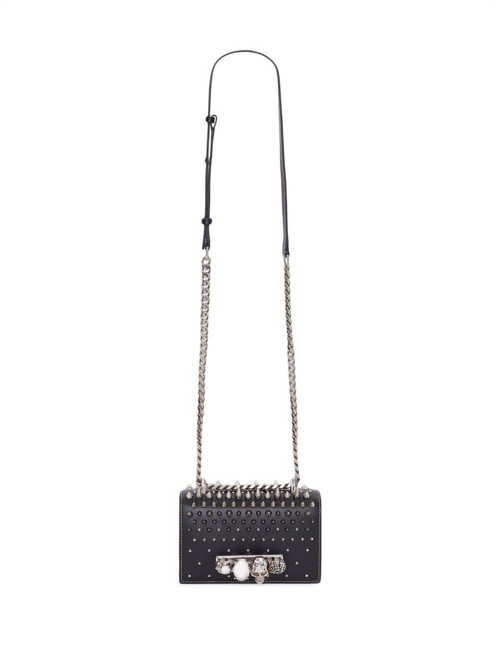 Mini Jewelled satchel bag from Alexander McQueen featuring black, calf leather, silver-tone stud embellishment, adjustable leather and chain-link shoulder strap, foldover top with press-stud fastening, main compartment and internal card slot.
