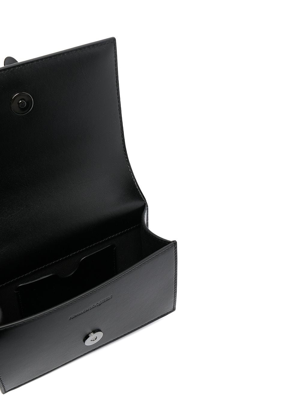 Tonal styling is an easy shortcut to sleek looks. This mini Jewelled Satchel crossbody bag from Alexander McQueen is complemented with black hardware and the signature Four Ring handle at the front. Give room for sombre elegance.