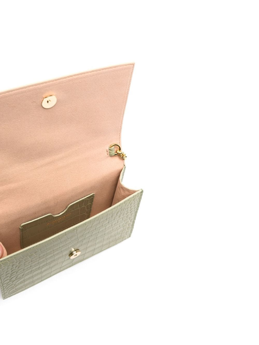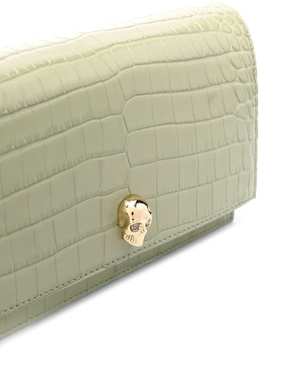 Skull crocodile-embossed shoulder bag from Alexander McQueen featuring green, leather, embossed crocodile effect, skull appliqué, foldover top with magnetic fastening, main compartment, internal card slot and chain-link shoulder strap.