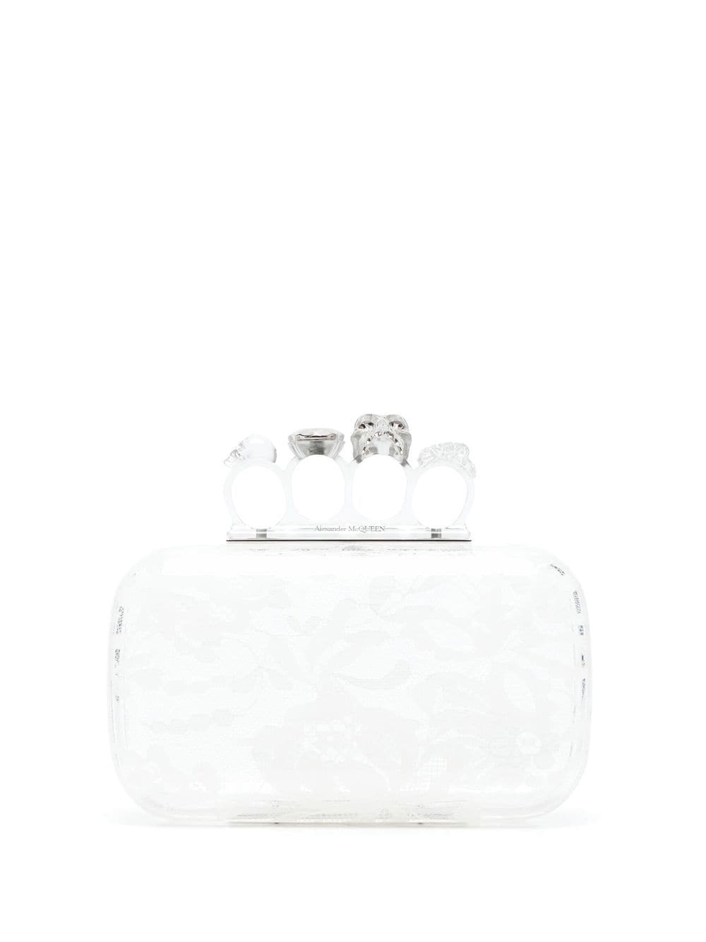 Skull Four-Ring clutch from Alexander McQueen featuring transparent design, silver-tone hardware, skull stud embellishment, knuckleduster design, clasp fastening, main compartment and white.