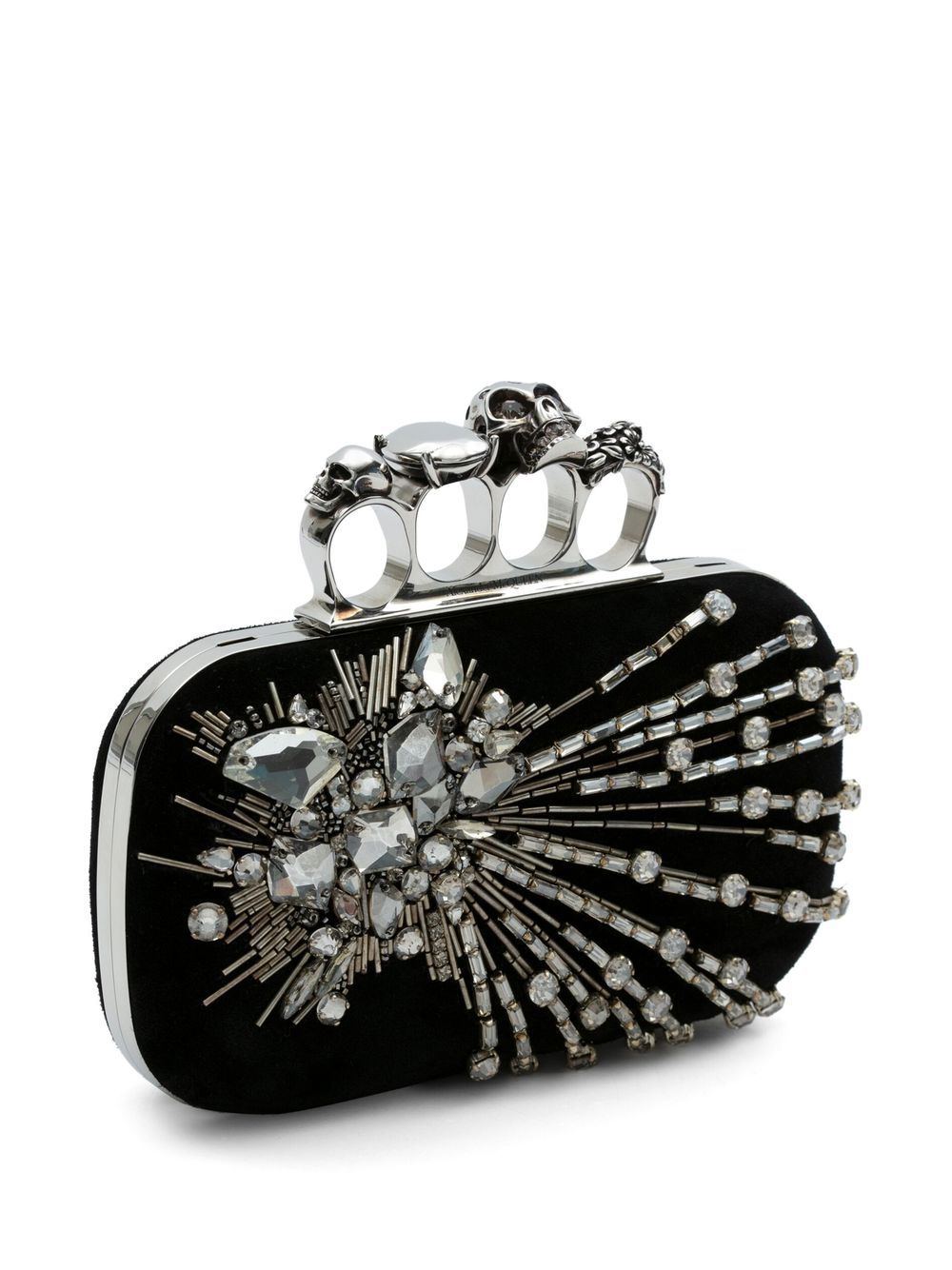 Skull Four Ring crystal-embellished clutch bag from Alexander McQueen featuring black, calf leather, Swarovski crystal embellishment, skull charm, silver-tone hardware, engraved logo, clasp fastening, detachable chain-link shoulder strap, signature Four Ring handle and main compartment.