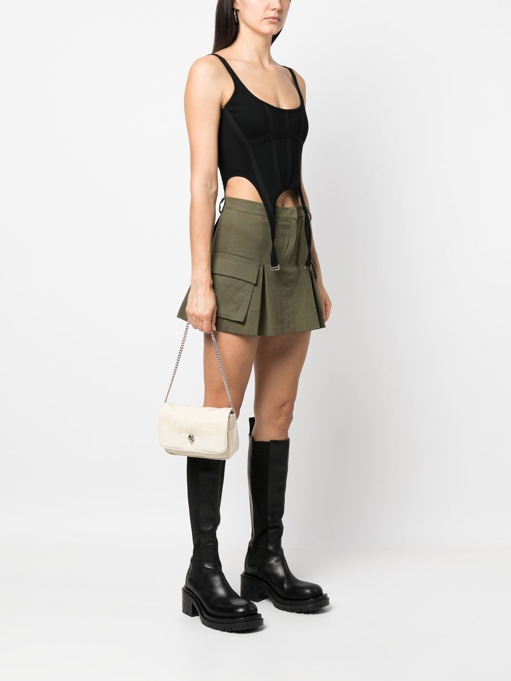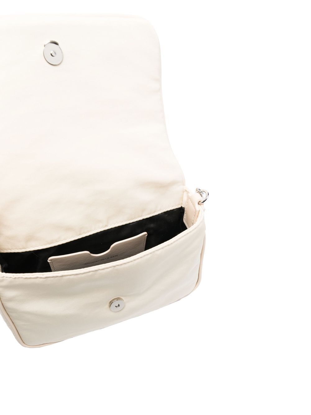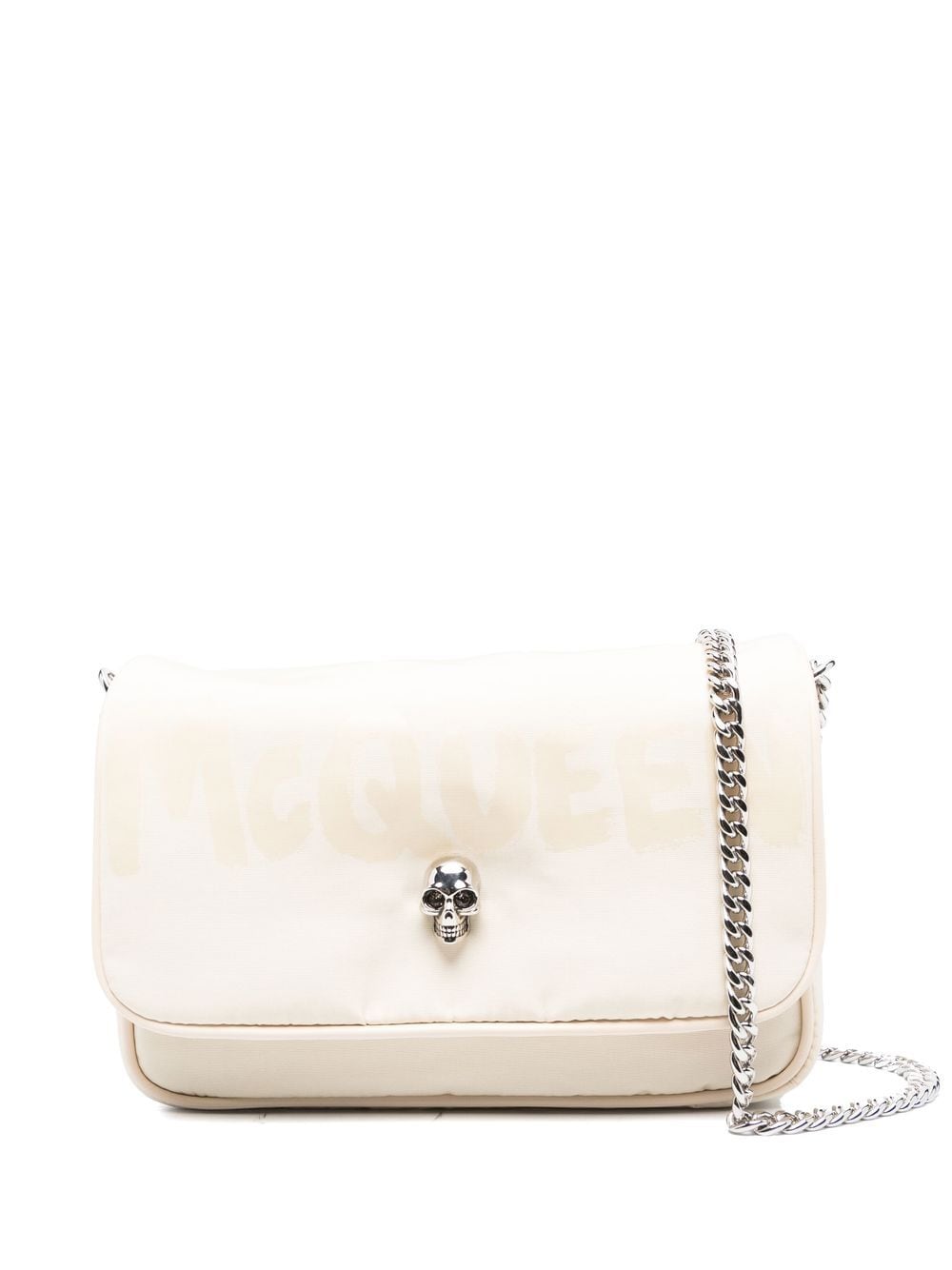 skull-plaque crossbody bag from Alexander McQueen featuring cream white, logo print to the front, skull stud detailing, foldover top with magnetic fastening, main compartment and chain-link shoulder strap.