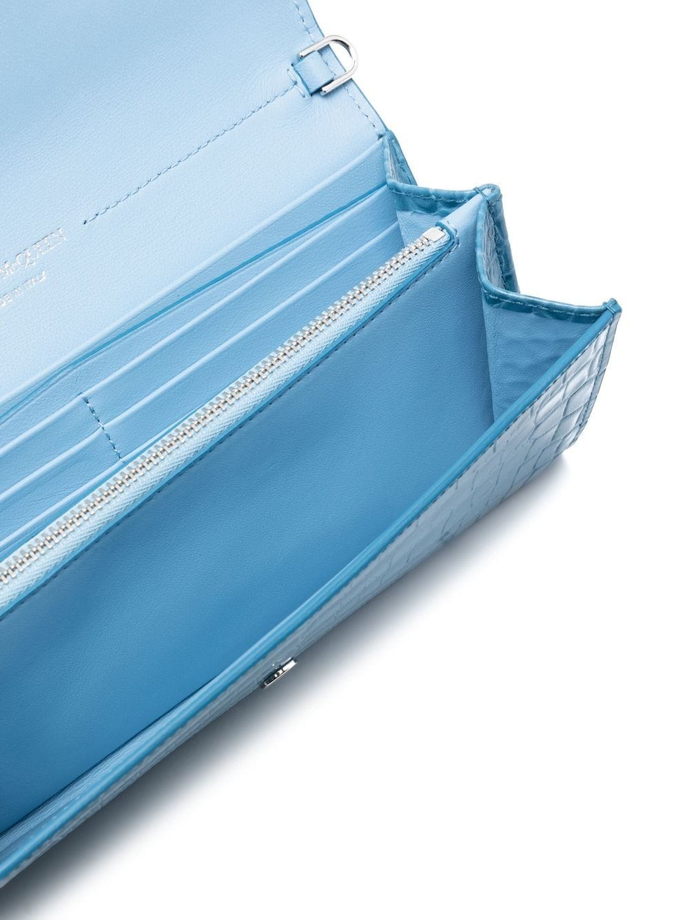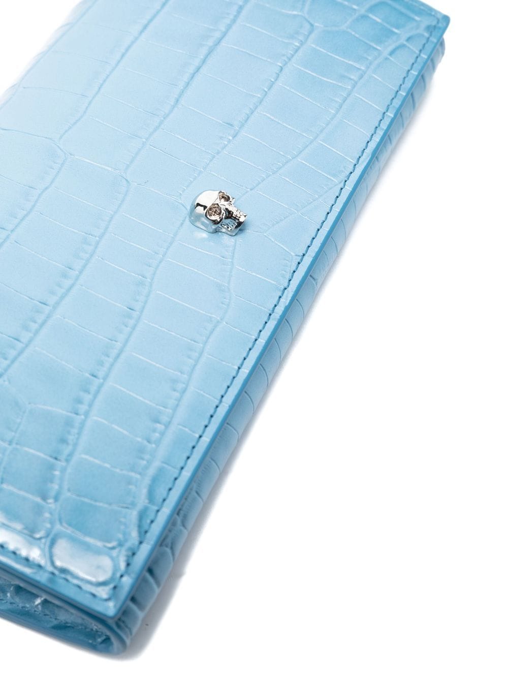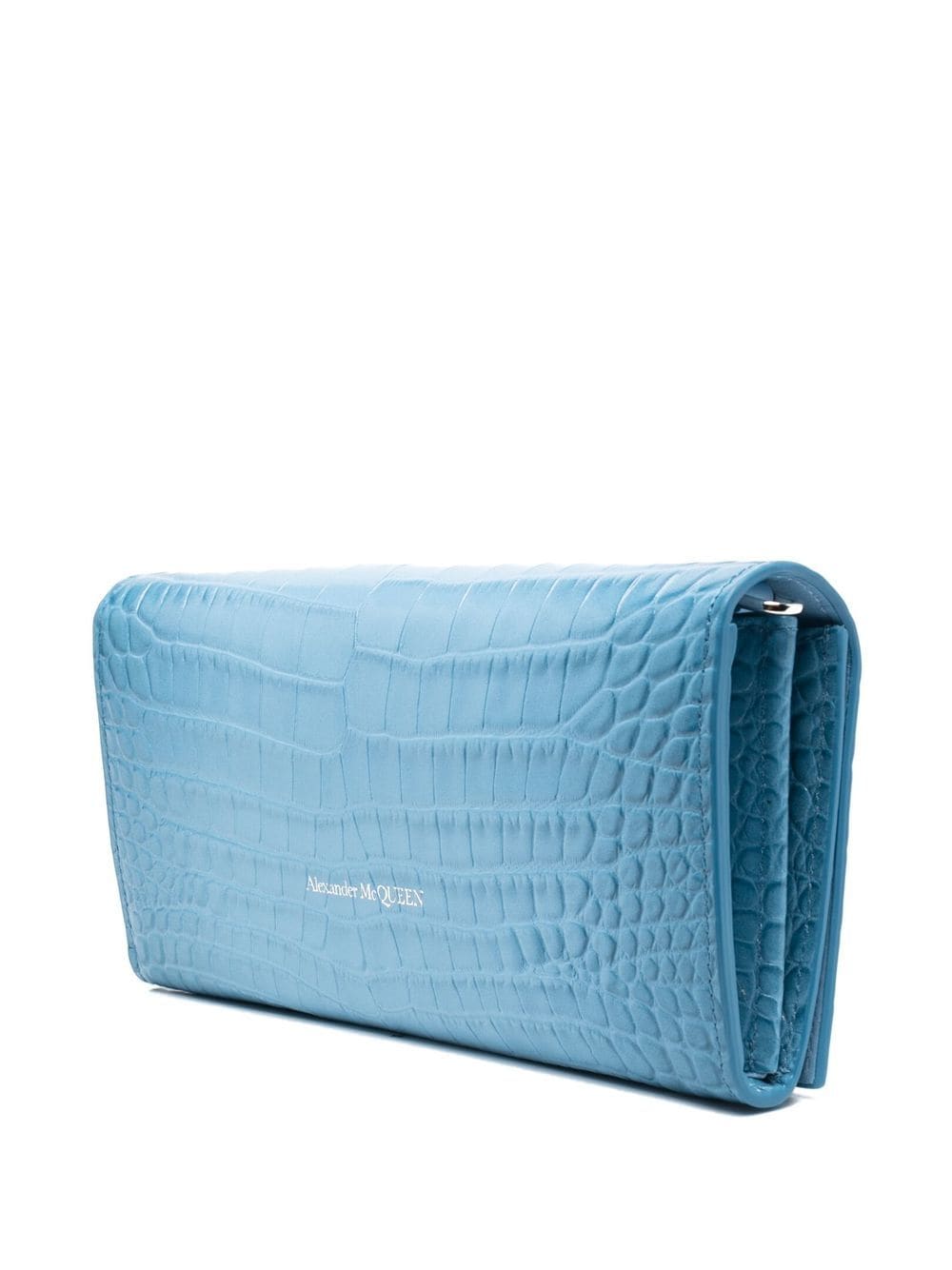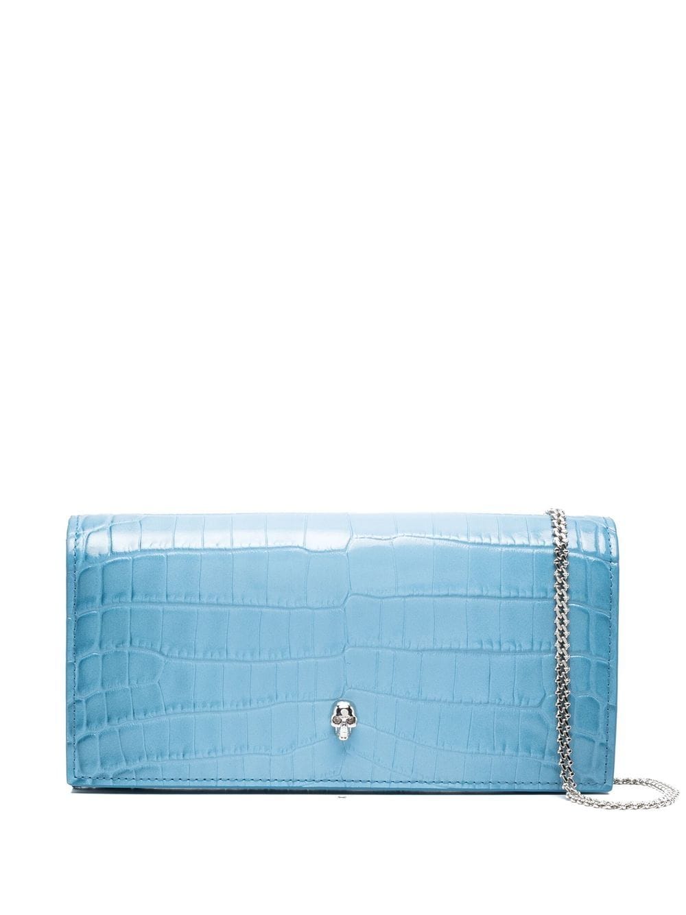 skull-stud leather shoulder bag from Alexander McQueen featuring blue, faux leather, embossed crocodile effect, skull stud detailing, silver-tone logo lettering, silver-tone hardware, chain-link shoulder strap, foldover top with magnetic fastening and main compartment.