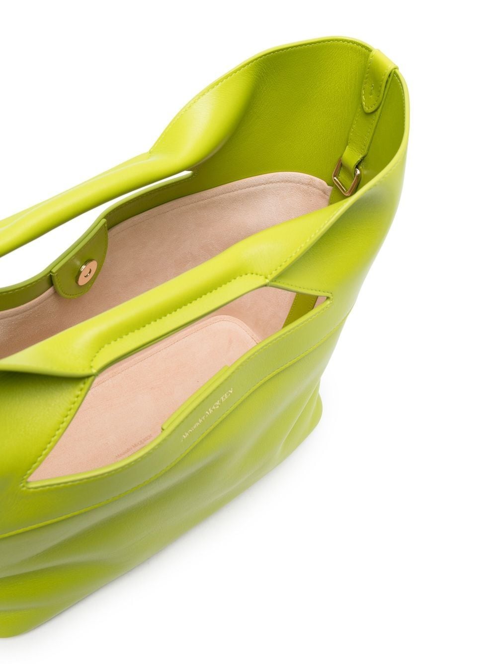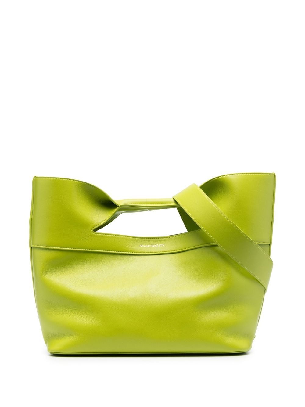 small Bow tote bag from Alexander McQueen featuring lime green, calf leather, logo stamp to the front, twisted top handles, cut-out detailing, magnetic fastening, main compartment, removable pouch and adjustable detachable shoulder strap.