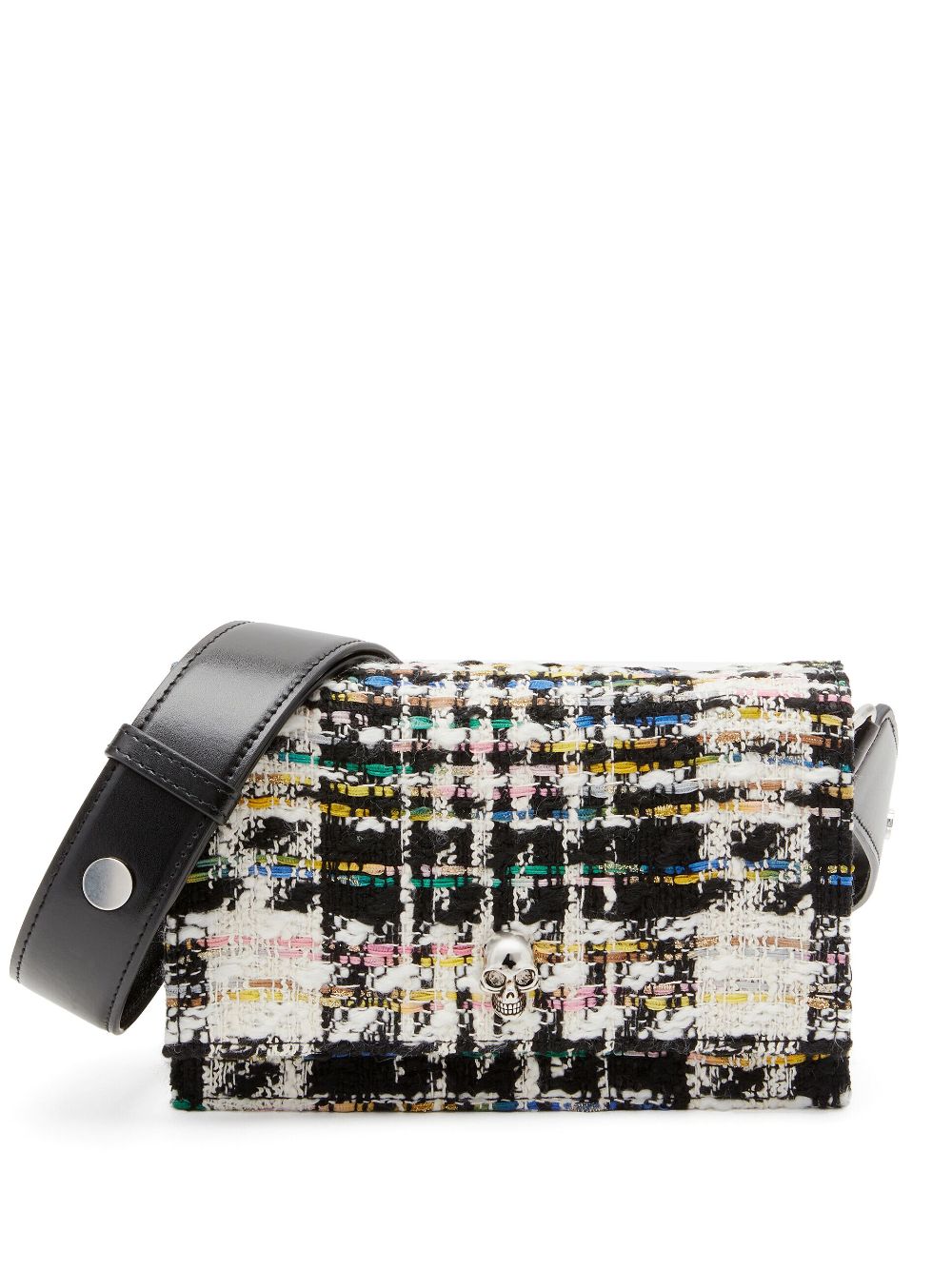 Alexander McQueen’s small Skull Bag is crafted from leather and multicoloured tweed, for an elegant touch. It features a wide biker-inspired shoulder strap.