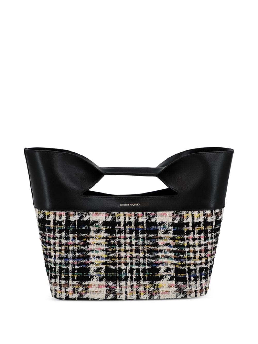 Reflective of Alexander McQueen’s sculptural influences, this leather bag boasts a structured silhouette defined by the cut-out handle, shaped to resemble a bow. This small iteration is highlighted with a multicoloured tweed panel that contrasts with the black leather top.