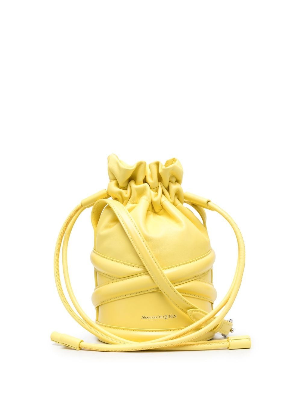 Soft Curve bucket bag from Alexander McQueen featuring yellow, leather, cylindrical design, crossover strap detail, logo print to the front, embossed logo to the rear, internal logo patch, main compartment, drawstring fastening and adjustable detachable shoulder strap.