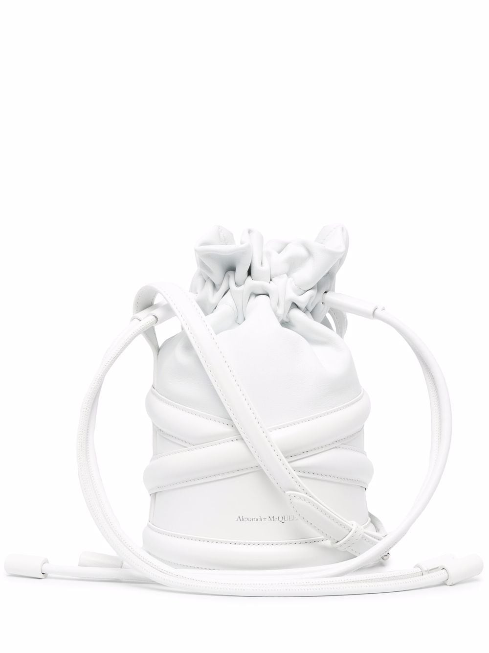 White Soft Curve bucket bag from Alexander McQueen featuring drawstring fastening, adjustable shoulder strap and main compartment.