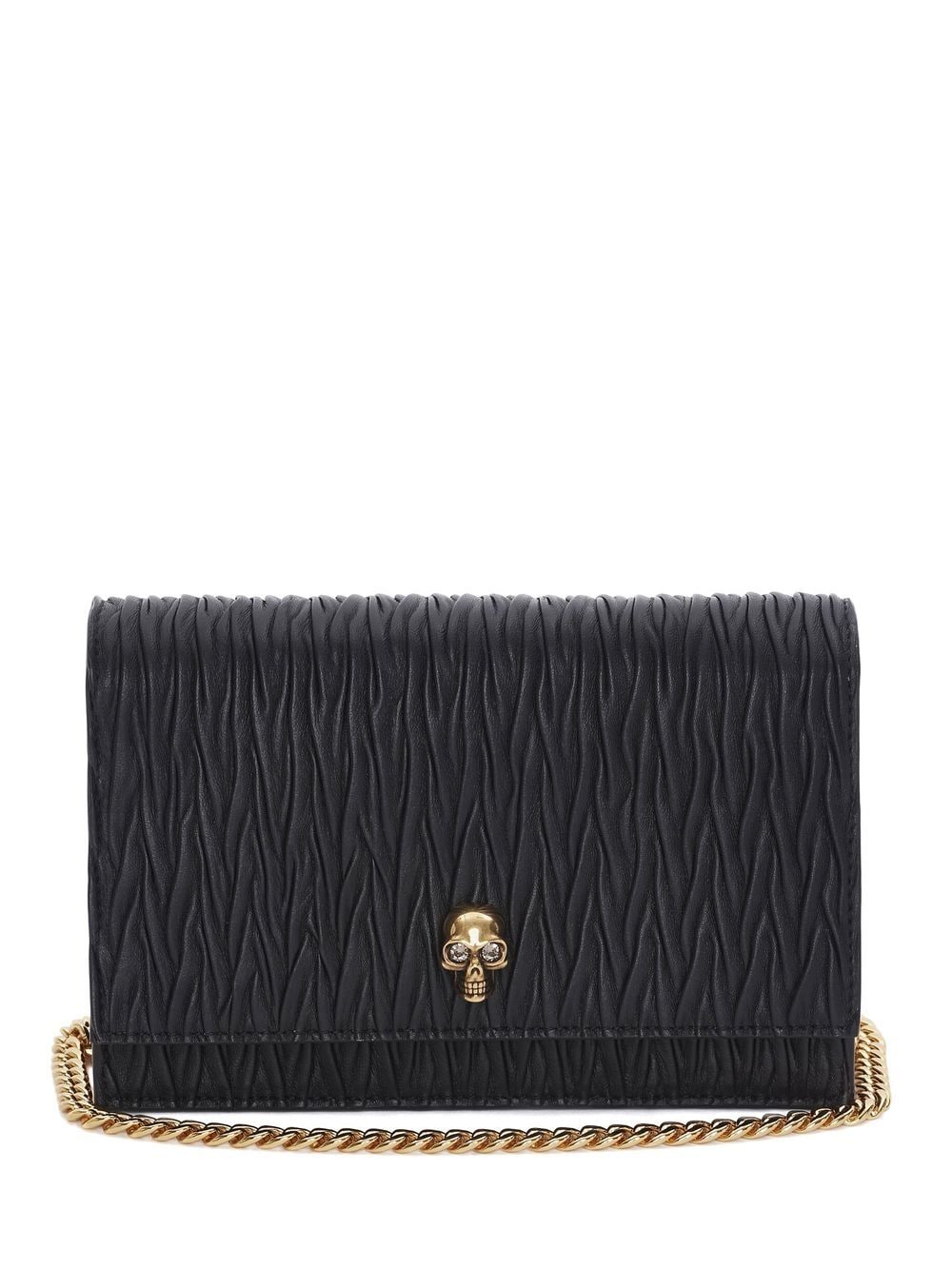 textured skull-embellished mini bag from Alexander McQueen featuring black, calf leather, skull stud embellishment, textured finish, foldover top, chain-link shoulder strap and main compartment.