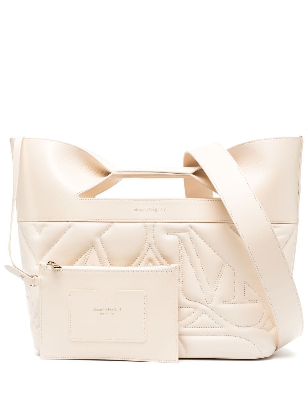 The Bow quilted tote bag from Alexander McQueen featuring cream white, calf leather, quilted, embossed logo to the front, two top handles, magnetic fastening, main compartment, removable pouch and adjustable detachable shoulder strap.