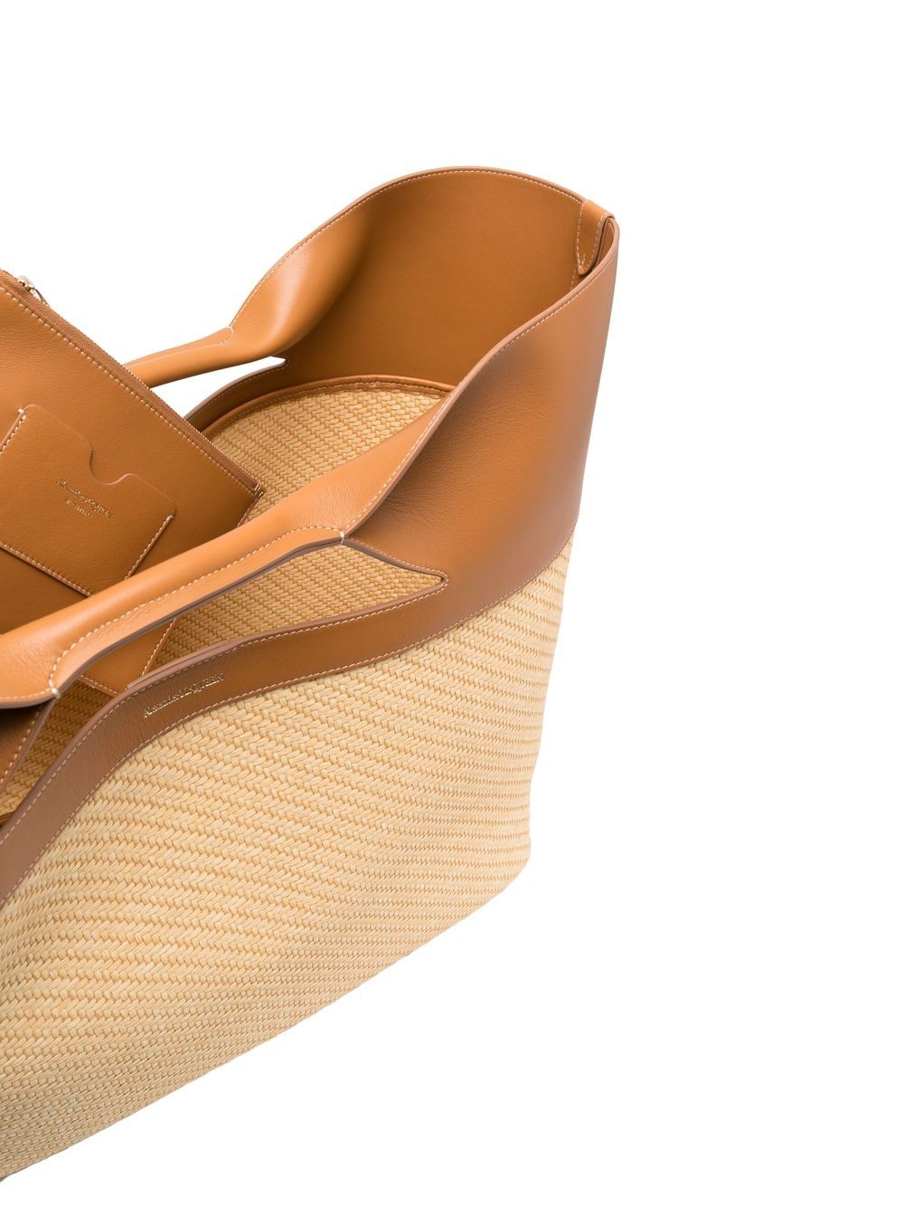 The Bow straw-woven tote bag from Alexander McQueen featuring beige, brown, straw, calf leather, two-tone design, flat top handles, removable pouch and main compartment.