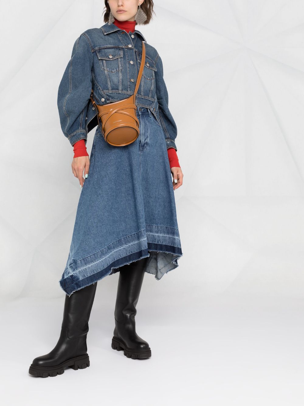 The most beautiful curve on a woman’s body is on her shoulder. That’s where you’ll find this Alexander McQueen bag and its unique bucket design. The smile is important, too, we must say.