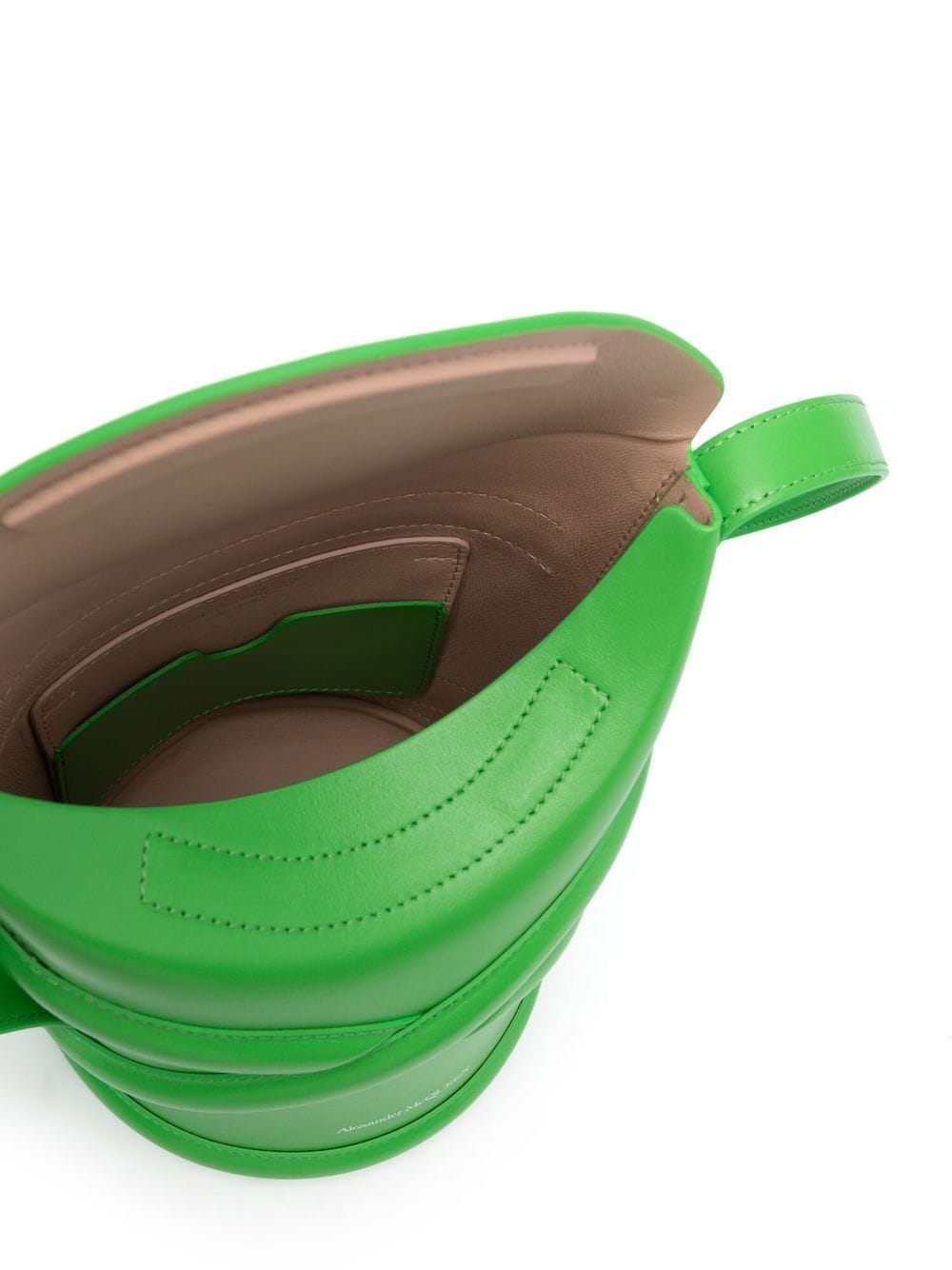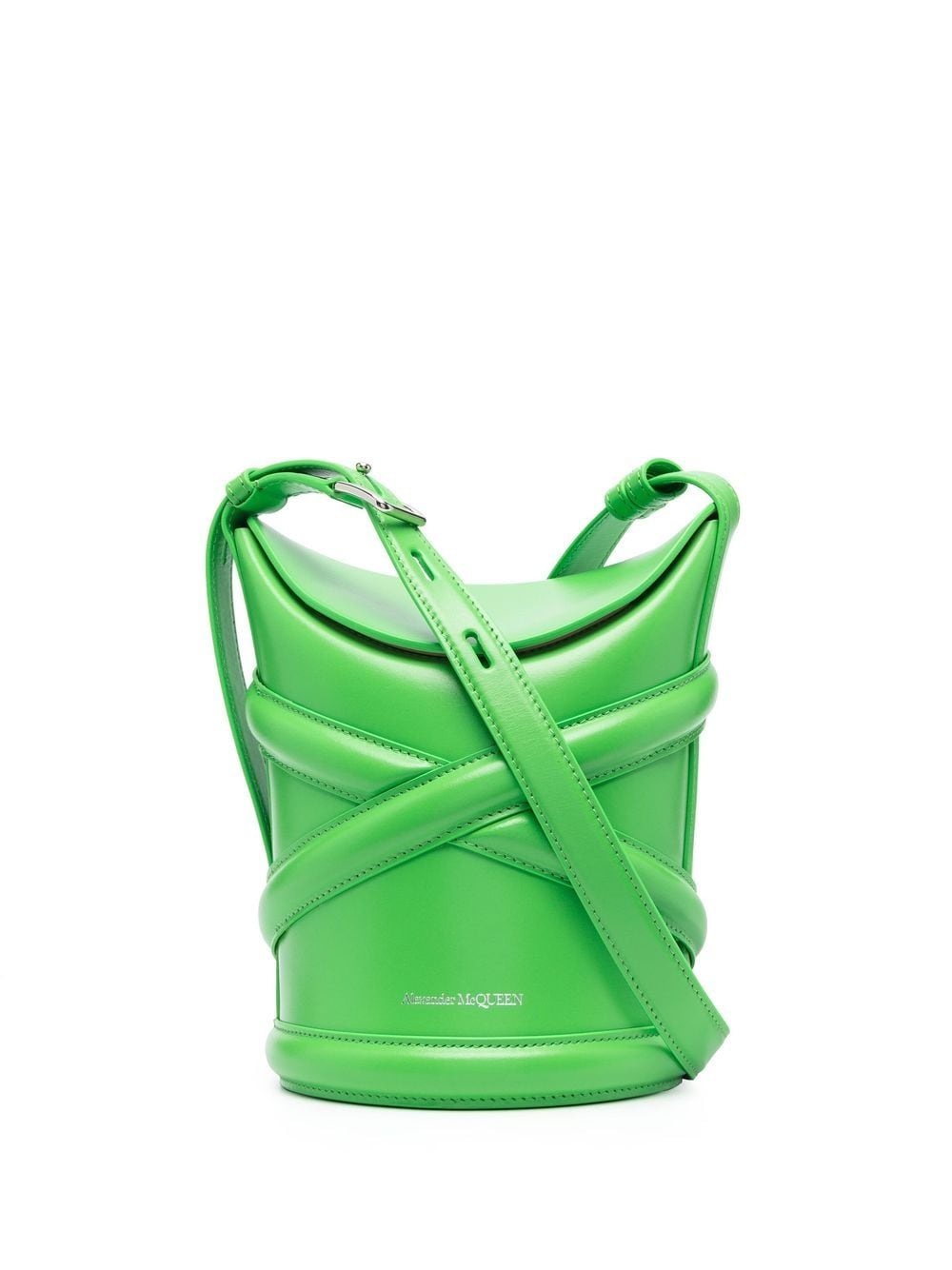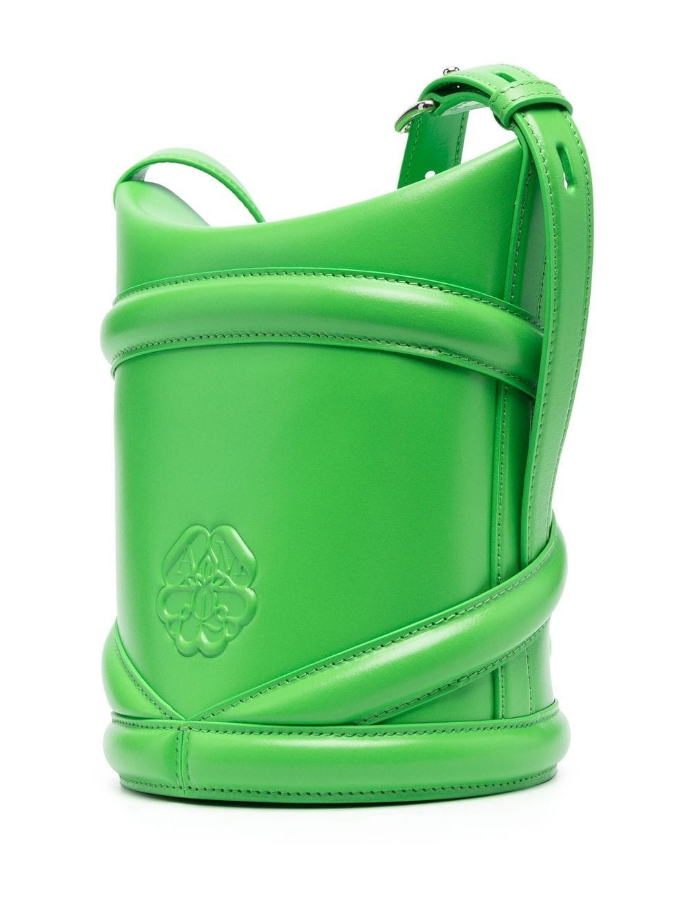 The Curve bucket bag from Alexander McQueen featuring apple green, leather, crossover strap detail, logo print to the front, debossed logo to the rear, internal logo stamp, main compartment, foldover top and adjustable shoulder strap.