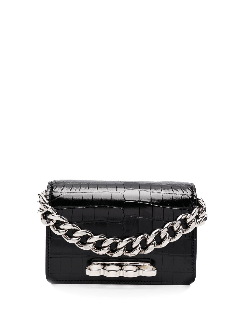 Black leather The Four Ring shoulder bag from Alexander McQueen featuring silver-tone hardware, crocodile effect, knuckleduster design, foldover top with magnetic fastening, main compartment and chain-link shoulder strap.