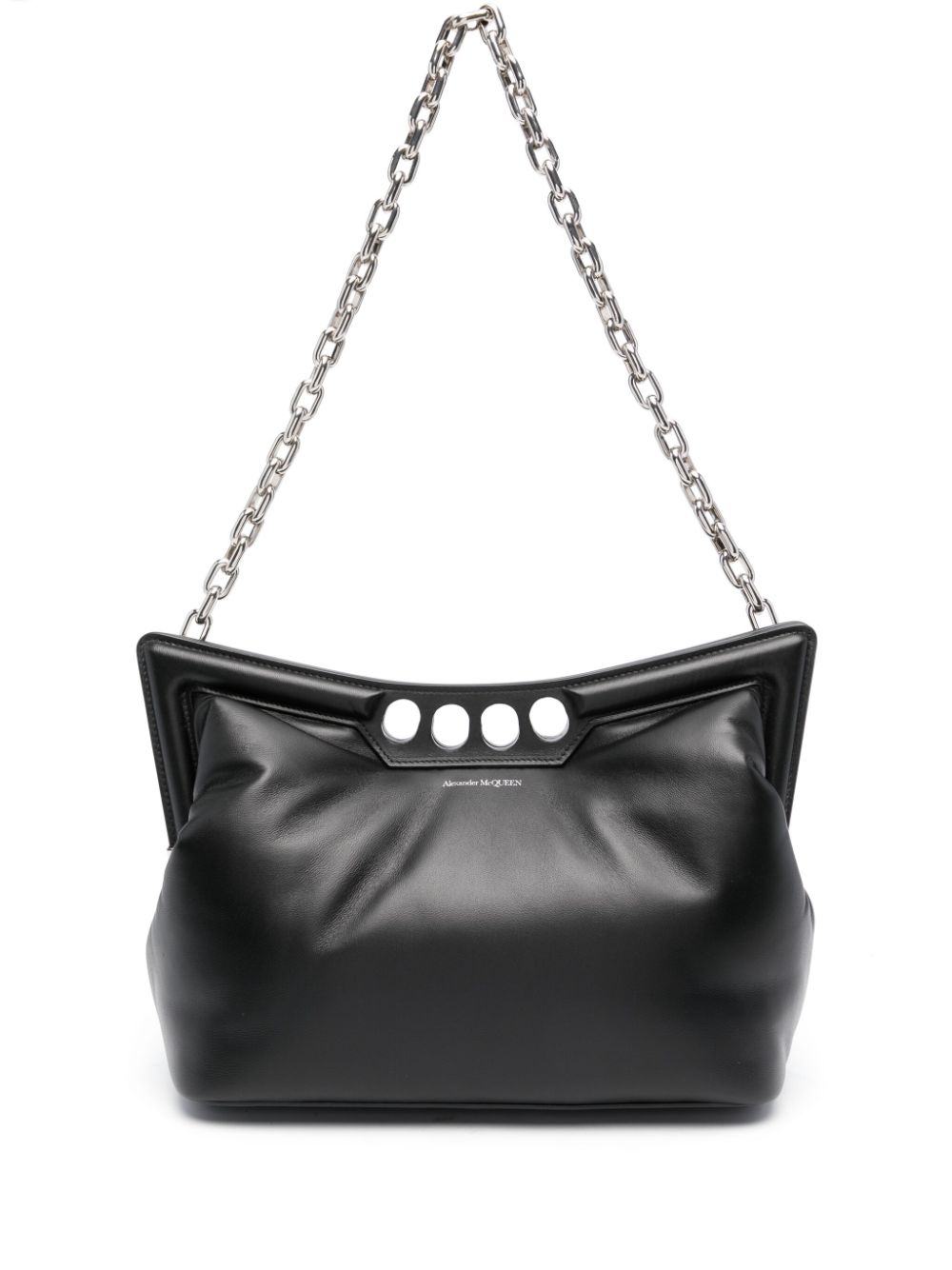 Combining several Alexander McQueen signatures, this black shoulder bag embodies the house’s bold ethos. It features a puffy leather silhouette framed by a pointed padded top and comes equipped with the signature Grip cut-out handle. A detachable chain-link shoulder strap enhances the design’s practicality.