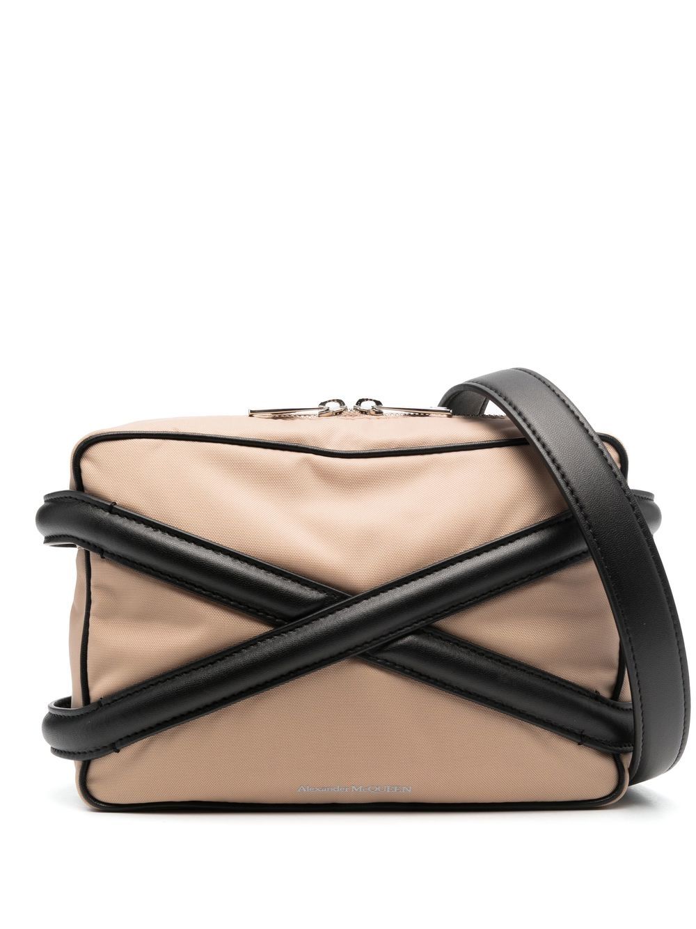 The Harness camera bag from Alexander McQueen featuring light beige, black, calf leather, leather trim, canvas, adjustable detachable shoulder strap, top zip fastening, main compartment, internal slip pocket and full lining.