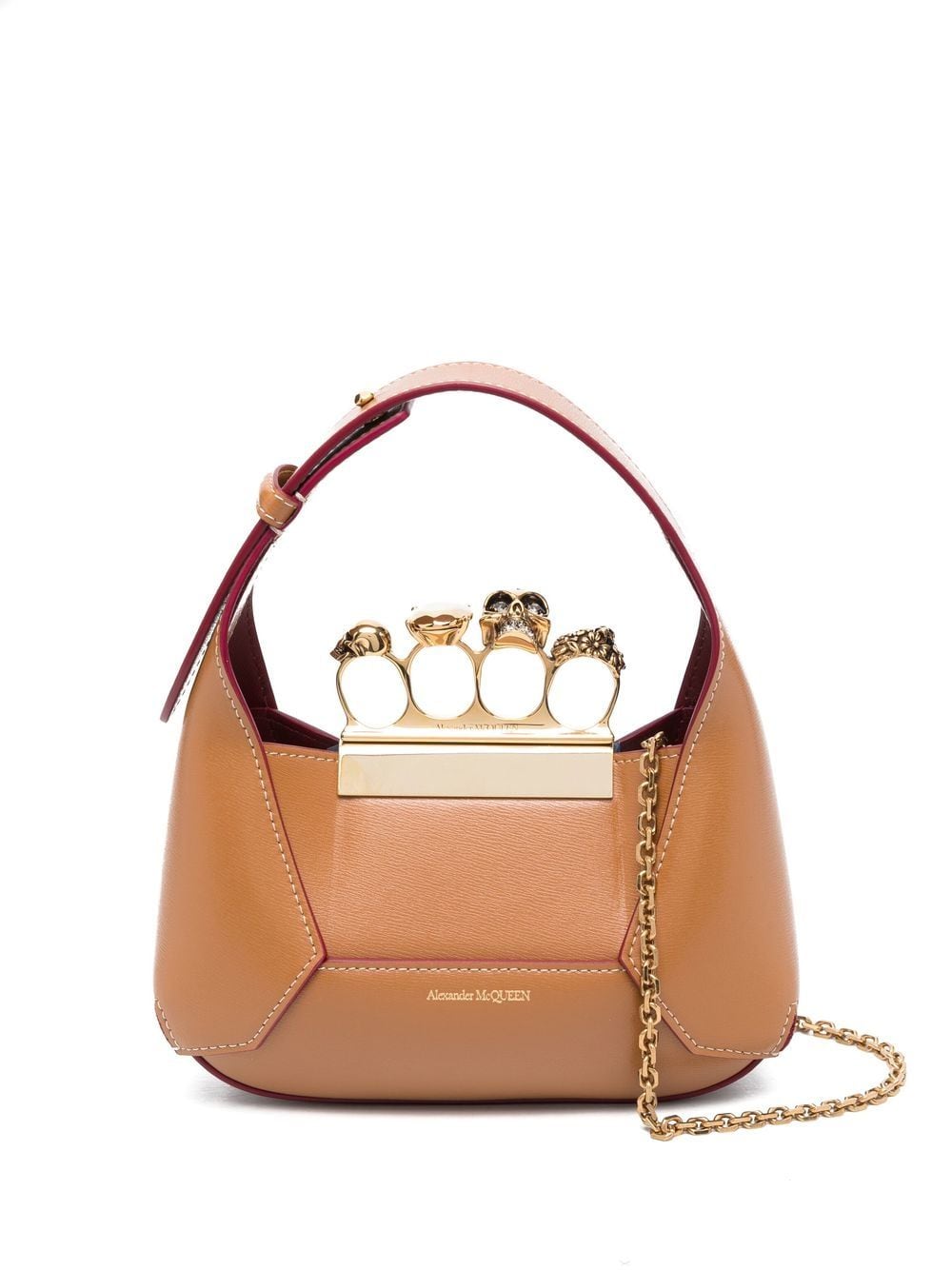 Alexander McQueen introduces the iconic The Jewelled bag: a geometric silhouette crafted from carefully hand-cut leather panels that are strategically reassembled, here in a mini iteration. At the top, the signature Four Ring handle boats Swarovski-encrusted skulls and studs for a distinguished finish.