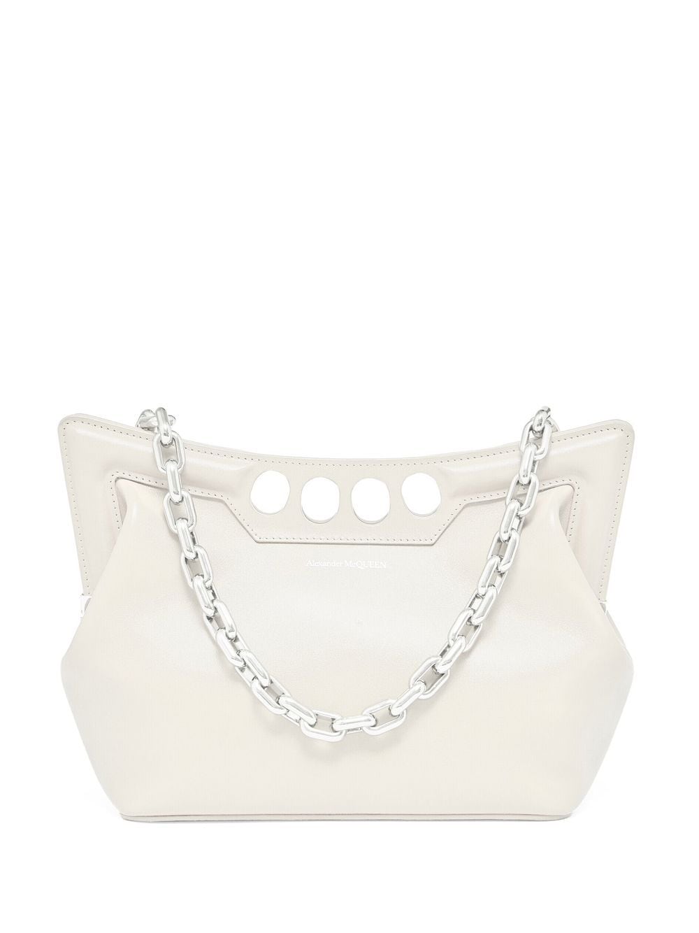 The Peak curved mini bag from Alexander McQueen featuring ivory white, leather, suede, contrast lining, silver-tone hardware, debossed logo to the front, concealed magnetic fastening, curve-edge body, detachable chain-link shoulder strap, internal flap pocket and main compartment.