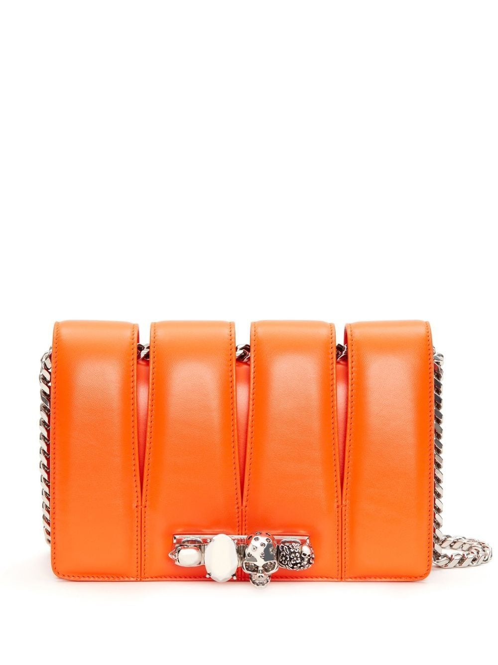 Defined by cut-out accents at the top, the Slash bag is crafted from smooth calf leather and infused with Alexander McQueen’s gothic-inspired ethos. Here, a Swarovski crystal-embellished Skull punctuates its bold Four Ring handle at the front, allowing the accessory to be worn in multiple ways.