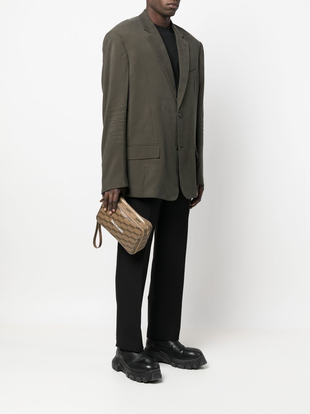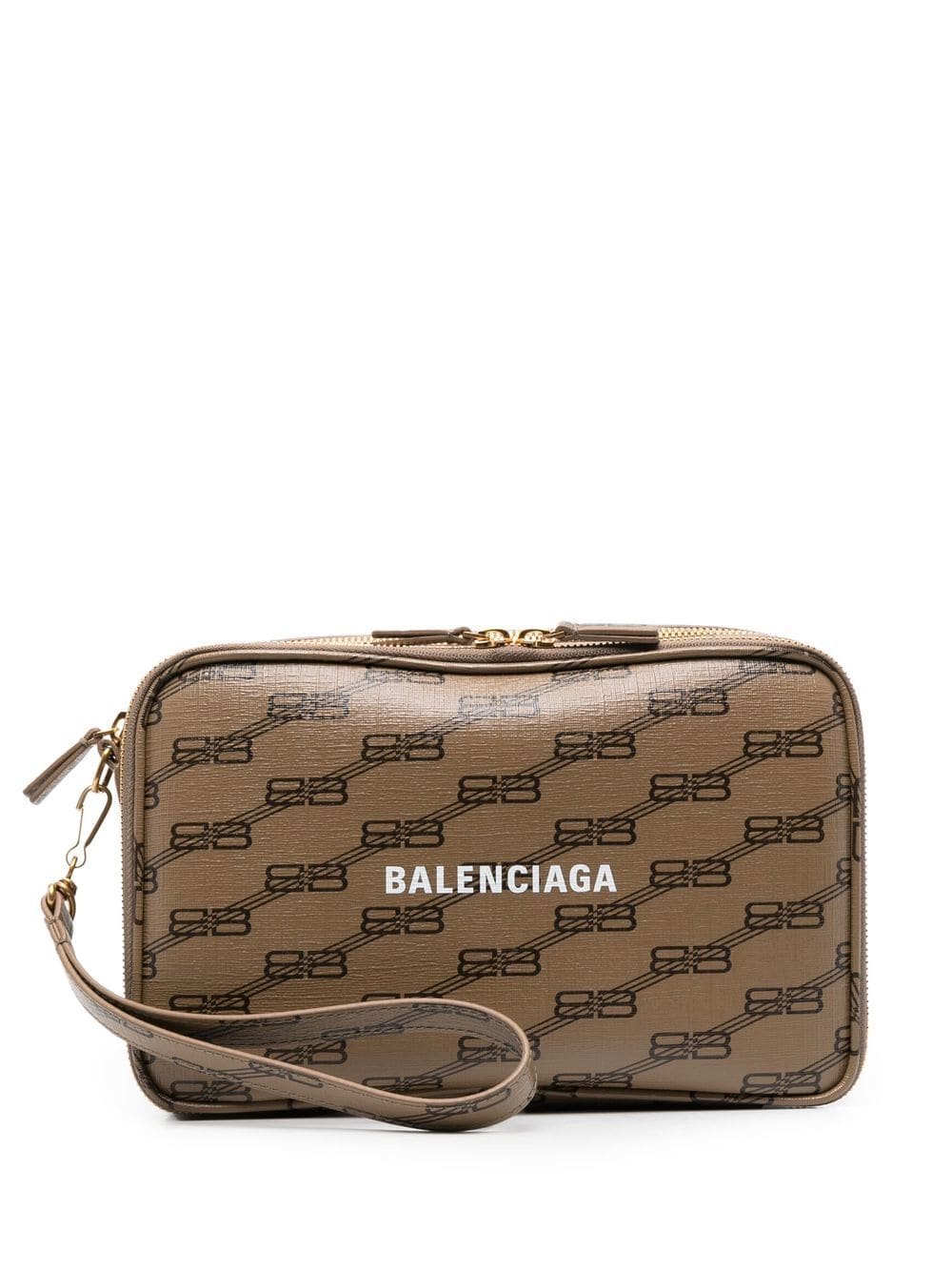 Cut from calf leather, this Balenciaga clutch bag is printed with the brand’s iconic BB logo all over. The compact accessory features a sizeable main compartment and a practical wrist strap.