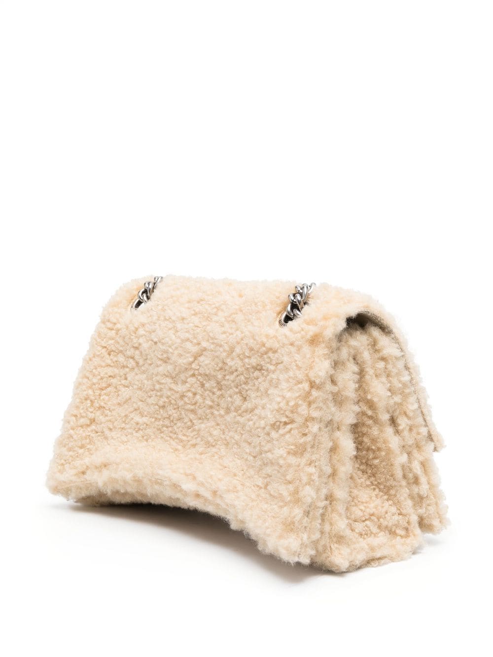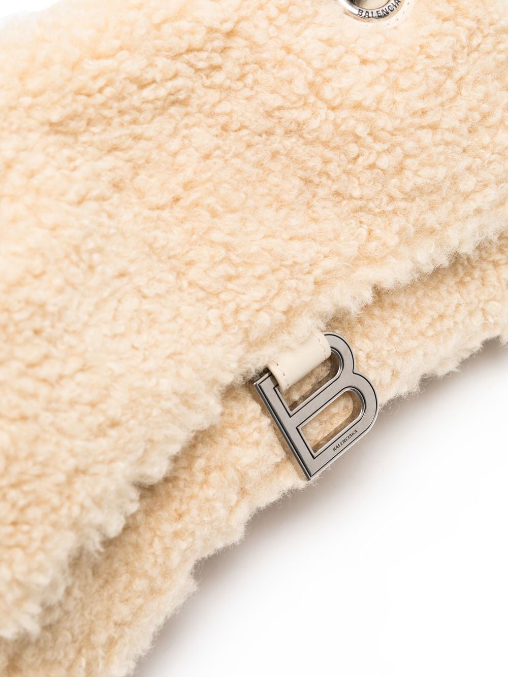 Balenciaga’s Crush bag is defined by its curved shape. This iteration is characterised by a furry bouclé finish and complemented by the iconic silver-tone ‘B’ logo plaque to the front of this beige-hued design.