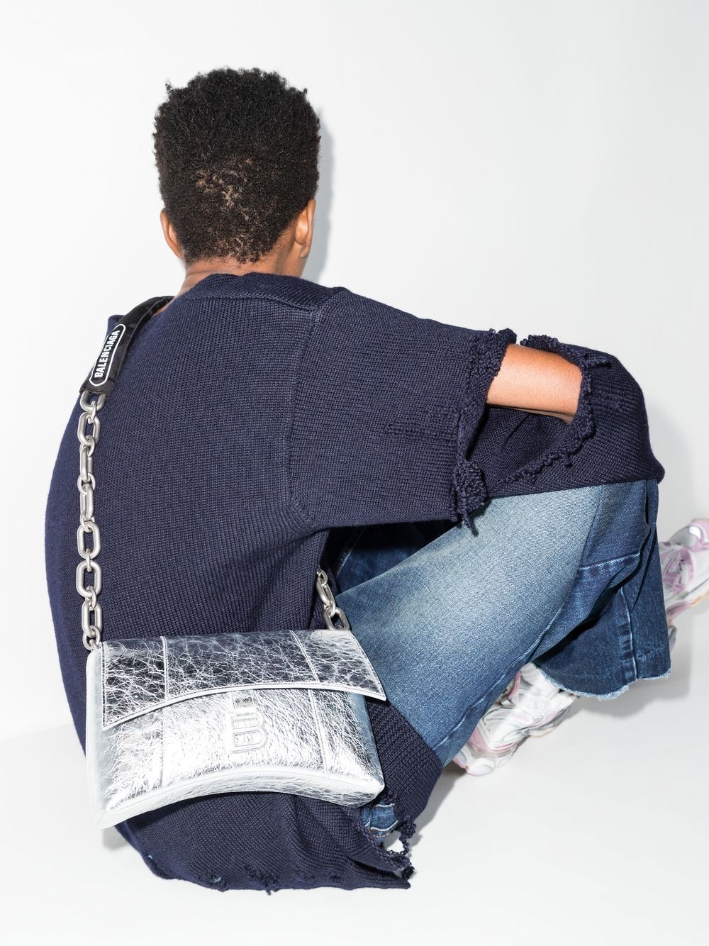 Balenciaga’s Downtown shoulder bag recieves a futuristic twist in this extra small metallic iteration. Imagined in a tonal silver-toned design, the bag is complete with bold branding seen on the chain-link shoulder strap cover and in the iconic ‘B’ logo plaque.