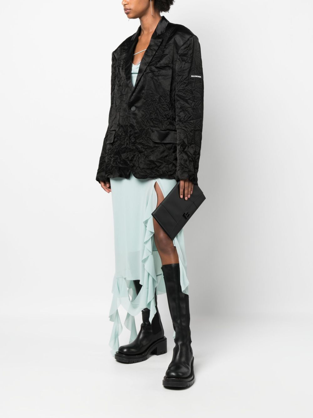 First appearing in Balenciaga’s pre-Fall 2021 show, Balenciaga presents its popular ‘Le Cagole’ shoulder bag in a mini size and with a gold-tone, metallic finish for AW22. Crafted from cracked-effect lambskin, this compact accessory features updated elements from the brand’s iconic Neo Classic silhouette, including crystal-embellished buckles and studs. The design includes a chain-link top handle and a detachable leather shoulder strap.