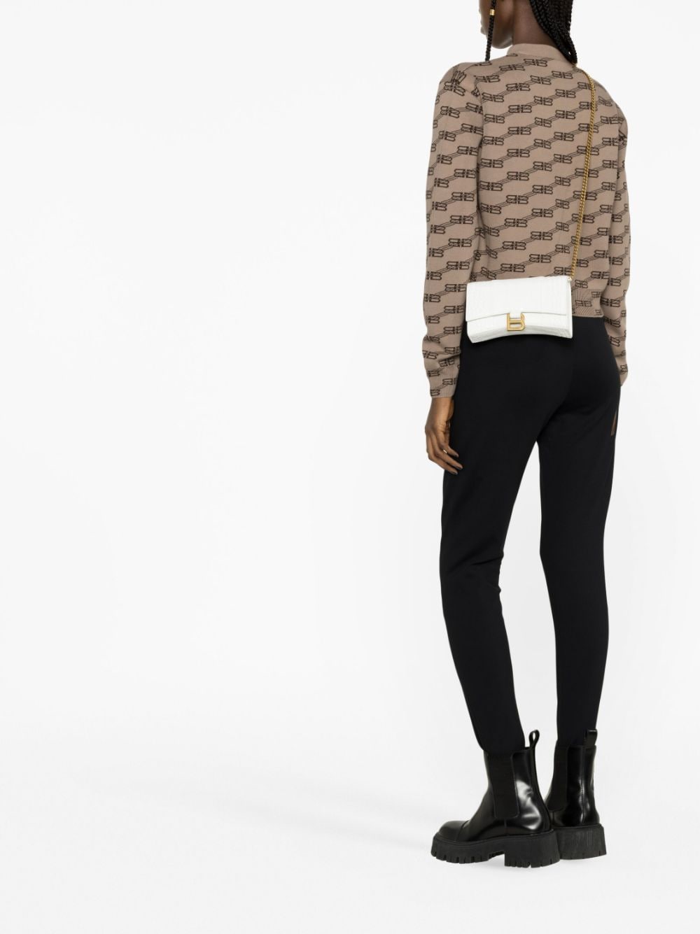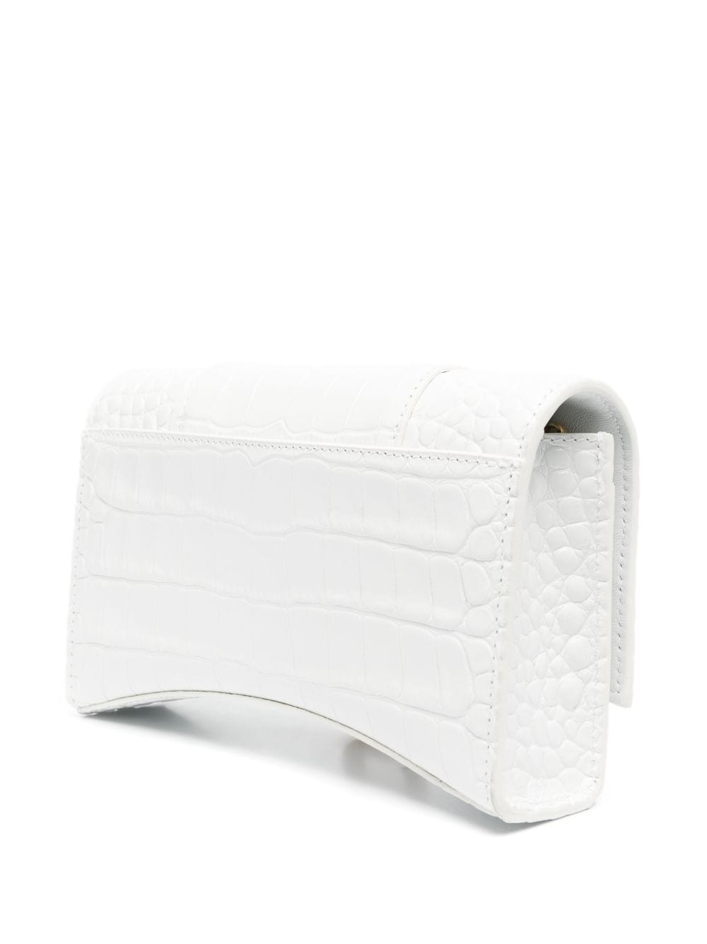 Inspired by outerwear silhouettes first introduced by founder Cristóbal Balenciaga, the Hourglass bag has become one of the brand’s most iconic shapes. The sculpted wallet-on-chain is re-invented for SS22 in optical white and elevated with an embossed crocodile effect.