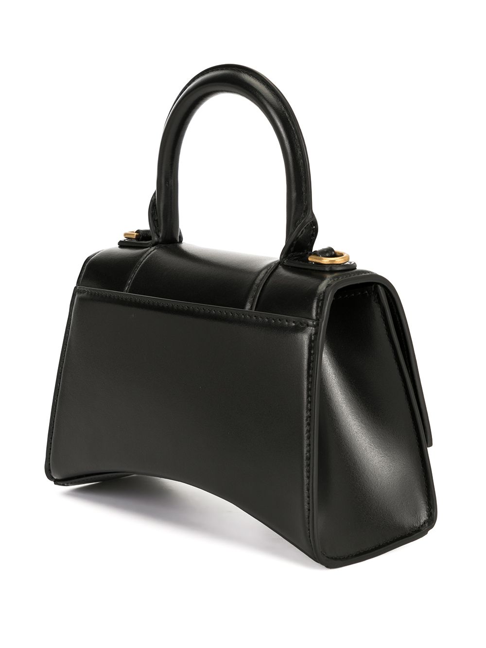 Defined by its curved base and structured silhouette, this XS Hourglass top-handle bag from Balenciaga is realised in black-toned smooth calf leather. A gold-tone ‘B’ logo completes the accessory.