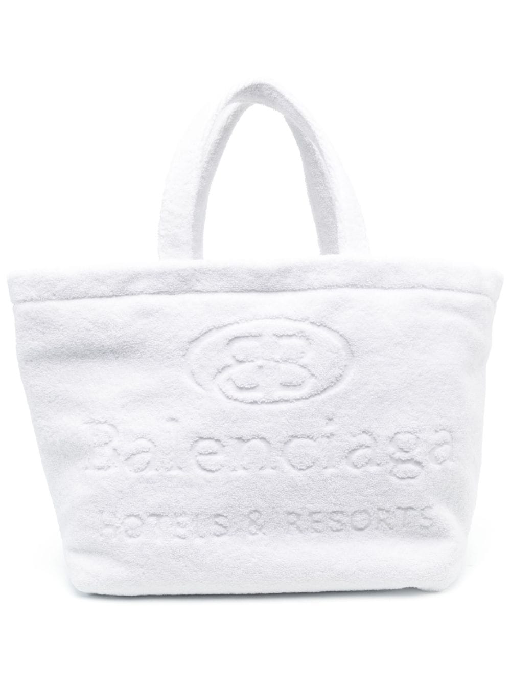 Balenciaga mimics the merchandise found in hotel resorts in this Jumbo tote bag. Embossed with their logo to the front, the textured terry cloth construction gives the piece a luxurious and leisurely feel.