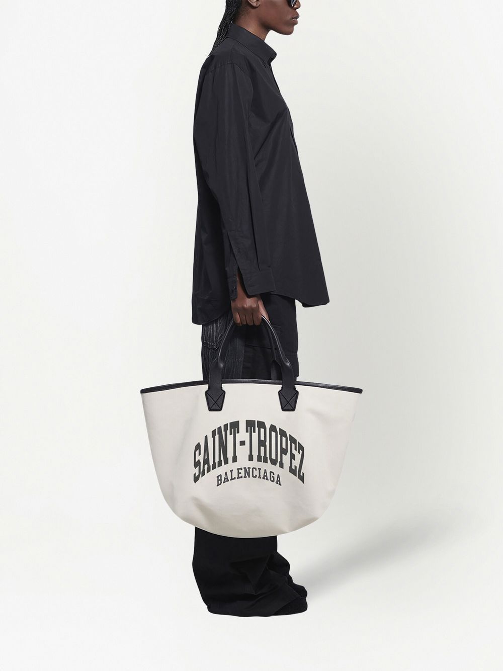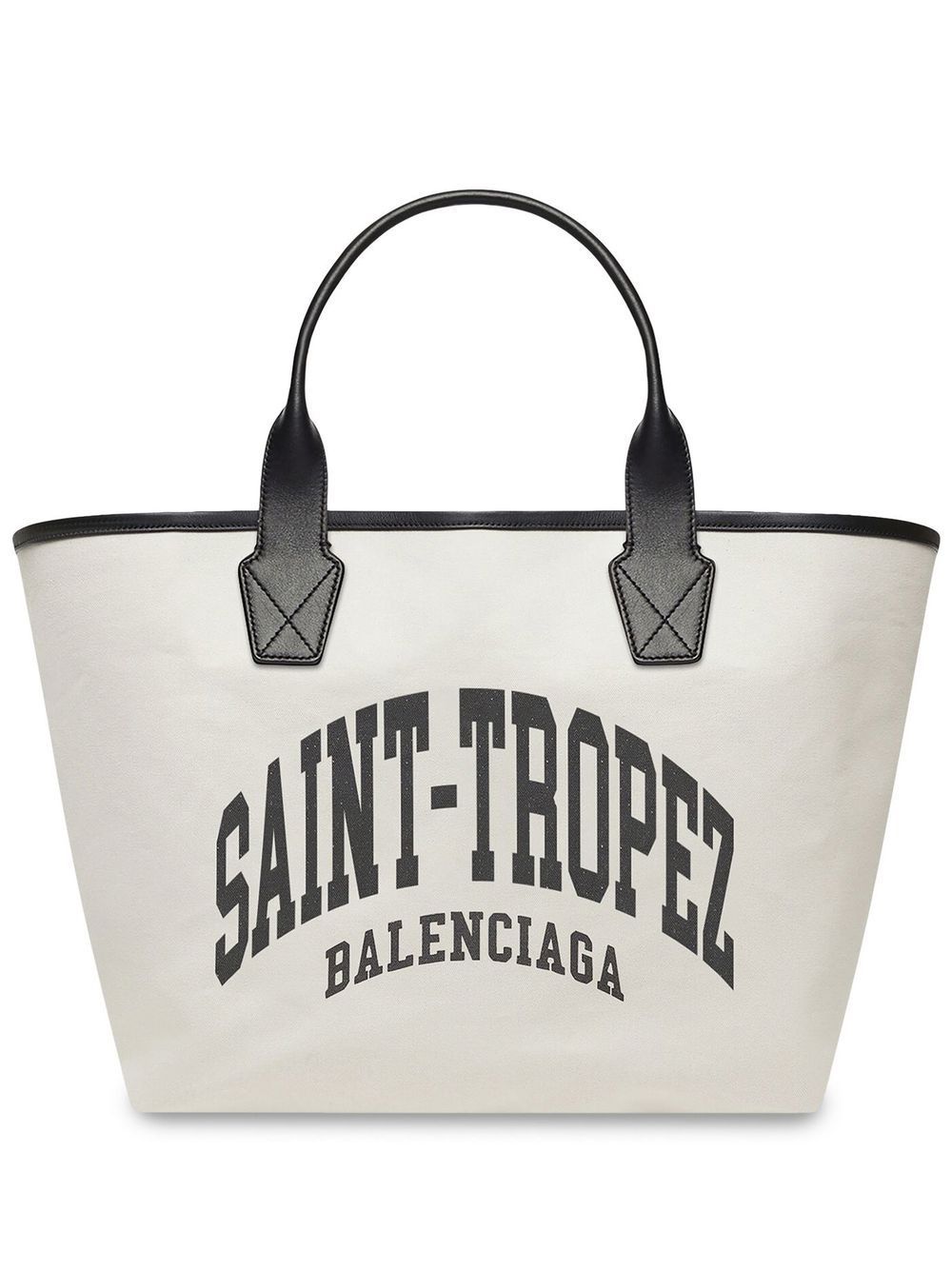 large Cities Saint-Tropez Jumbo tote bag from BALENCIAGA featuring black, light beige, canvas, leather trim, slogan print, logo lettering, two long top handles, open top, main compartment and internal zip-fastening pocket. Conscious: We’ve partnered with Good On You – an ethical agency that rates how sustainably brands perform. This item comes from a brand that performs well in relation to their impact on the planet..
