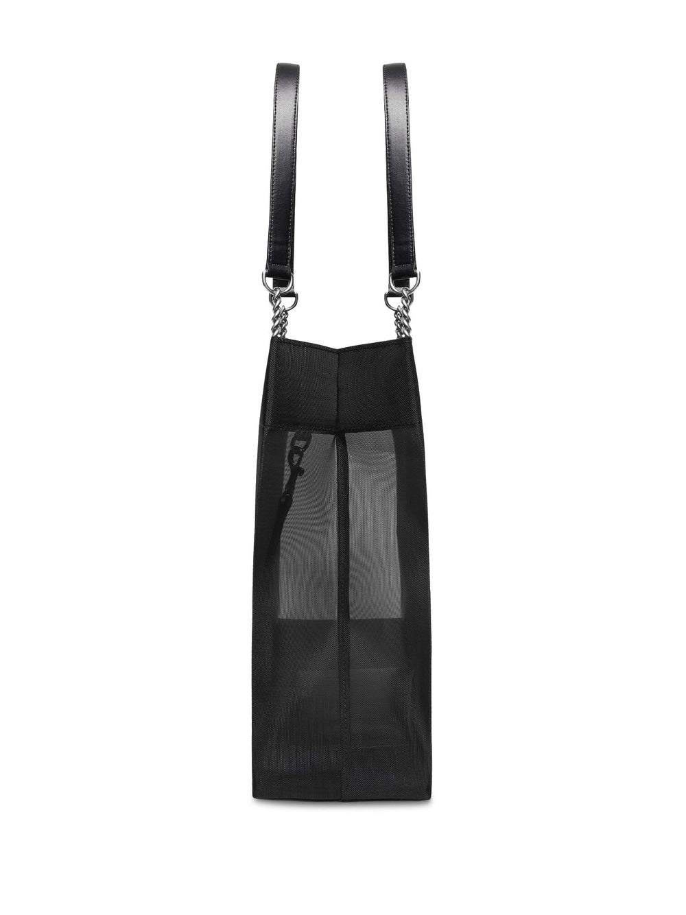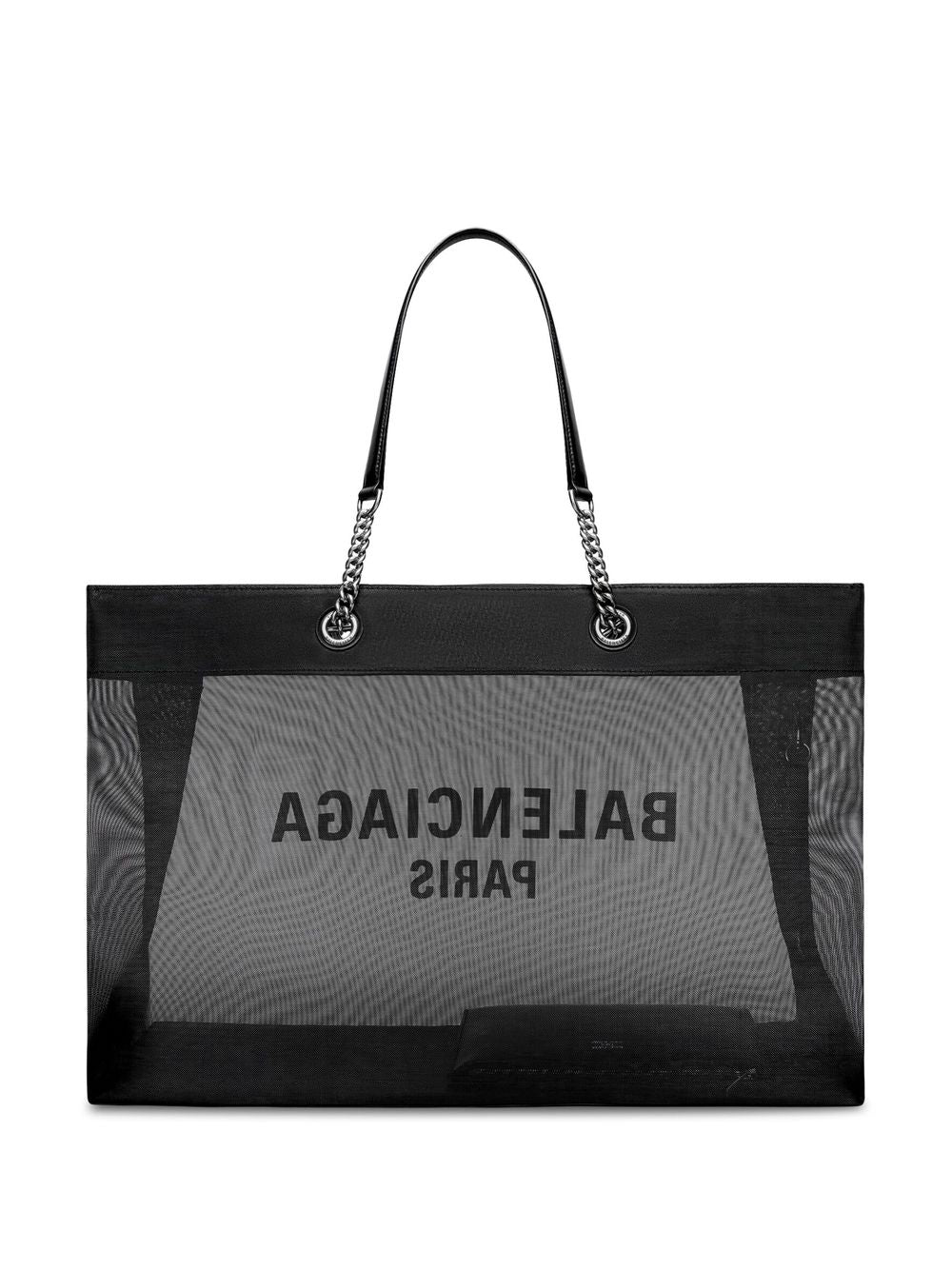 • Featuring the iconic Balenciaga logo print to the front, this Duty Free mesh tote bag comes with an open top and a removable pouch. The aged-silver chain-link and leather handles merge with an industrial look to create one legitimate Balenciaga design.