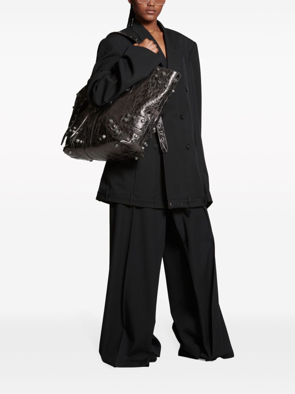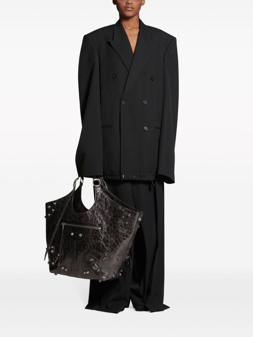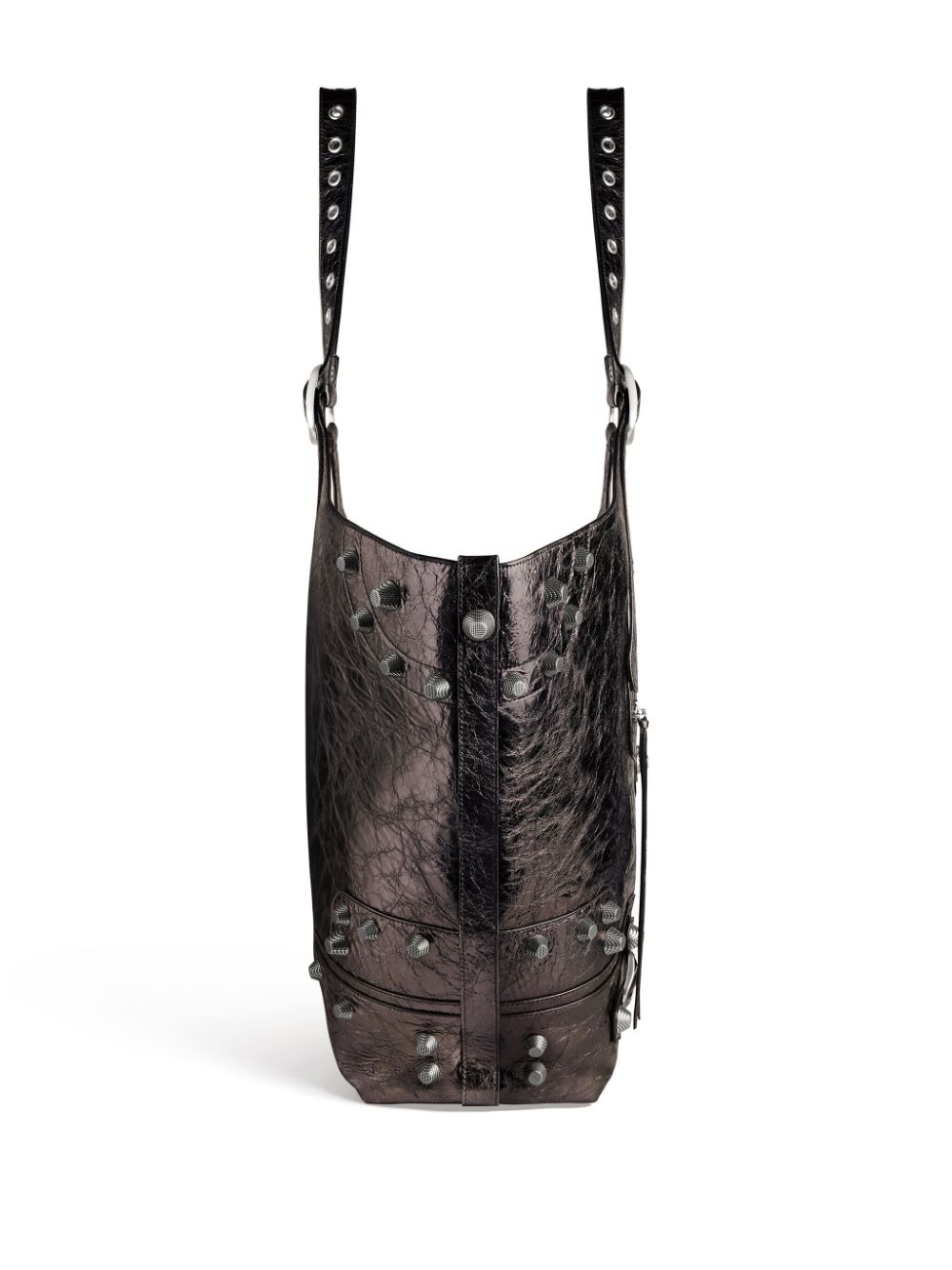 Taking its name from the French stereotype describing a cool and confident girl from Marseille, Balenciaga’s Le Cagole bag collection adopts the maximalist aesthetic of the character in its bold design. This large grey tote iteration is accented with studs and eyelets that trace the distressed leather construction, It comes with a handy front zip pocket and adjustable strap.
