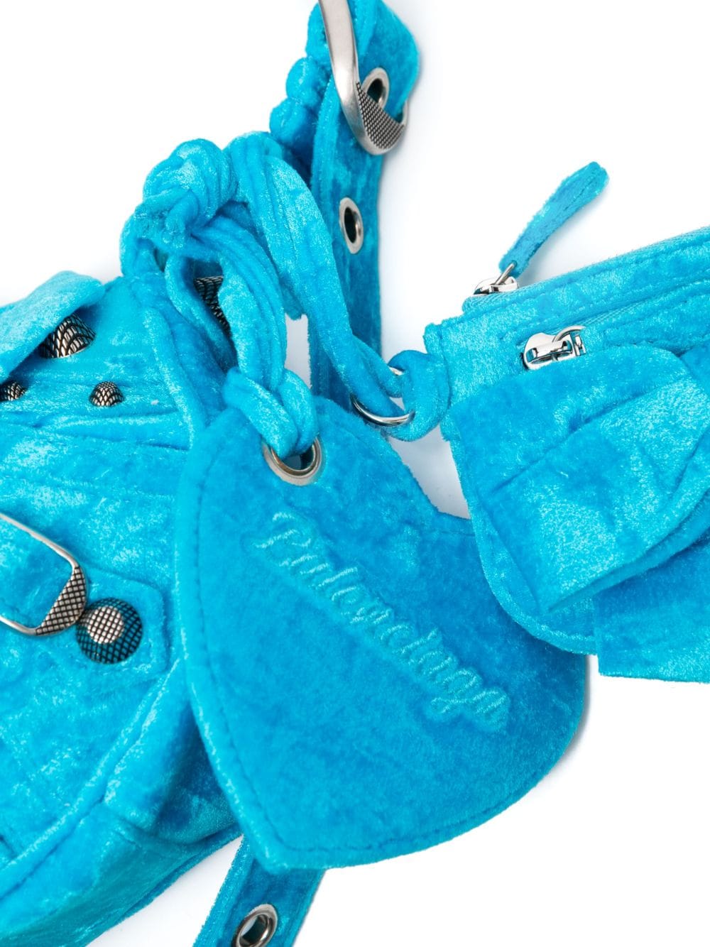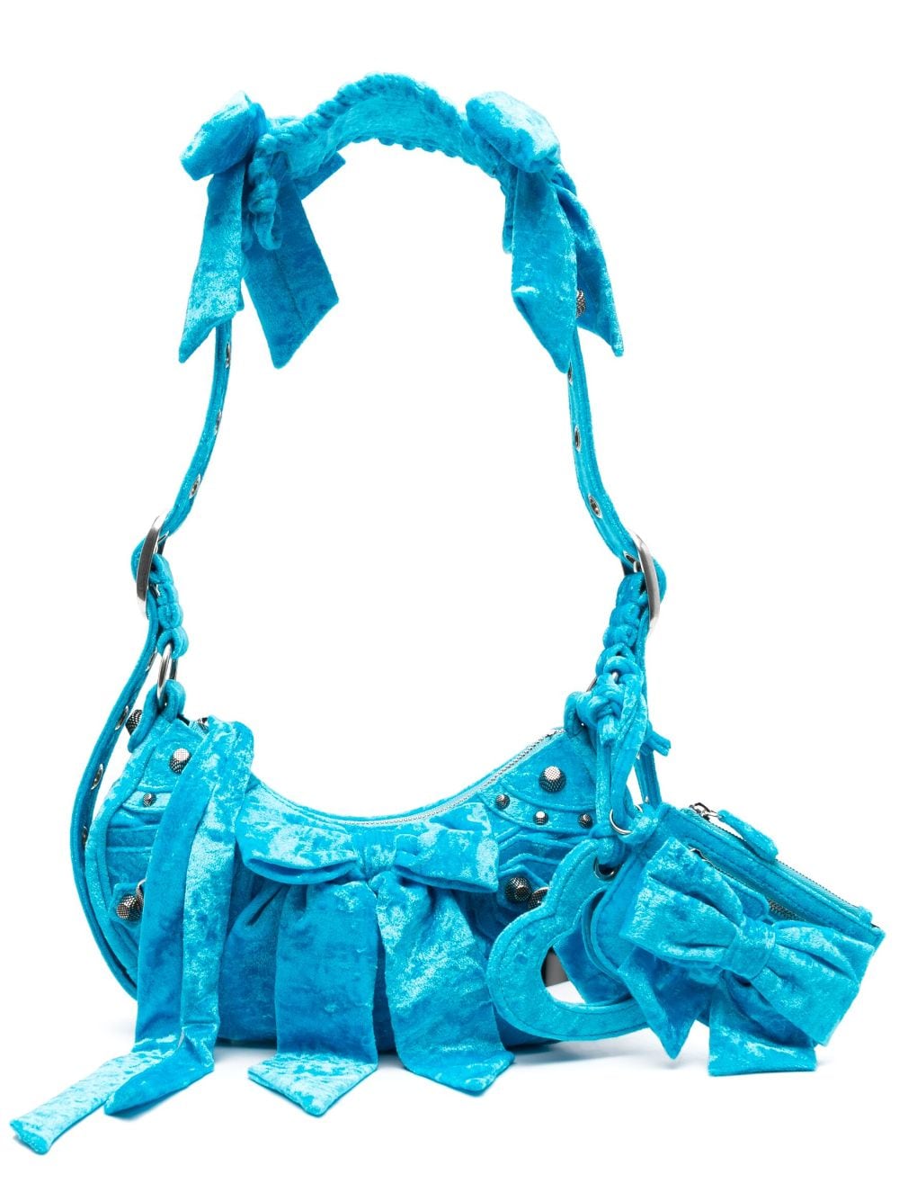 Balenciaga presents the Le Cagole XS shoulder bag. Crafted from crushed velvet in a vibrant blue hue, this accessory features elements from the brand’s iconic Neo Classic silhouette, including decorative bows, flat studs and a whipstitch-detailed adjustable strap.