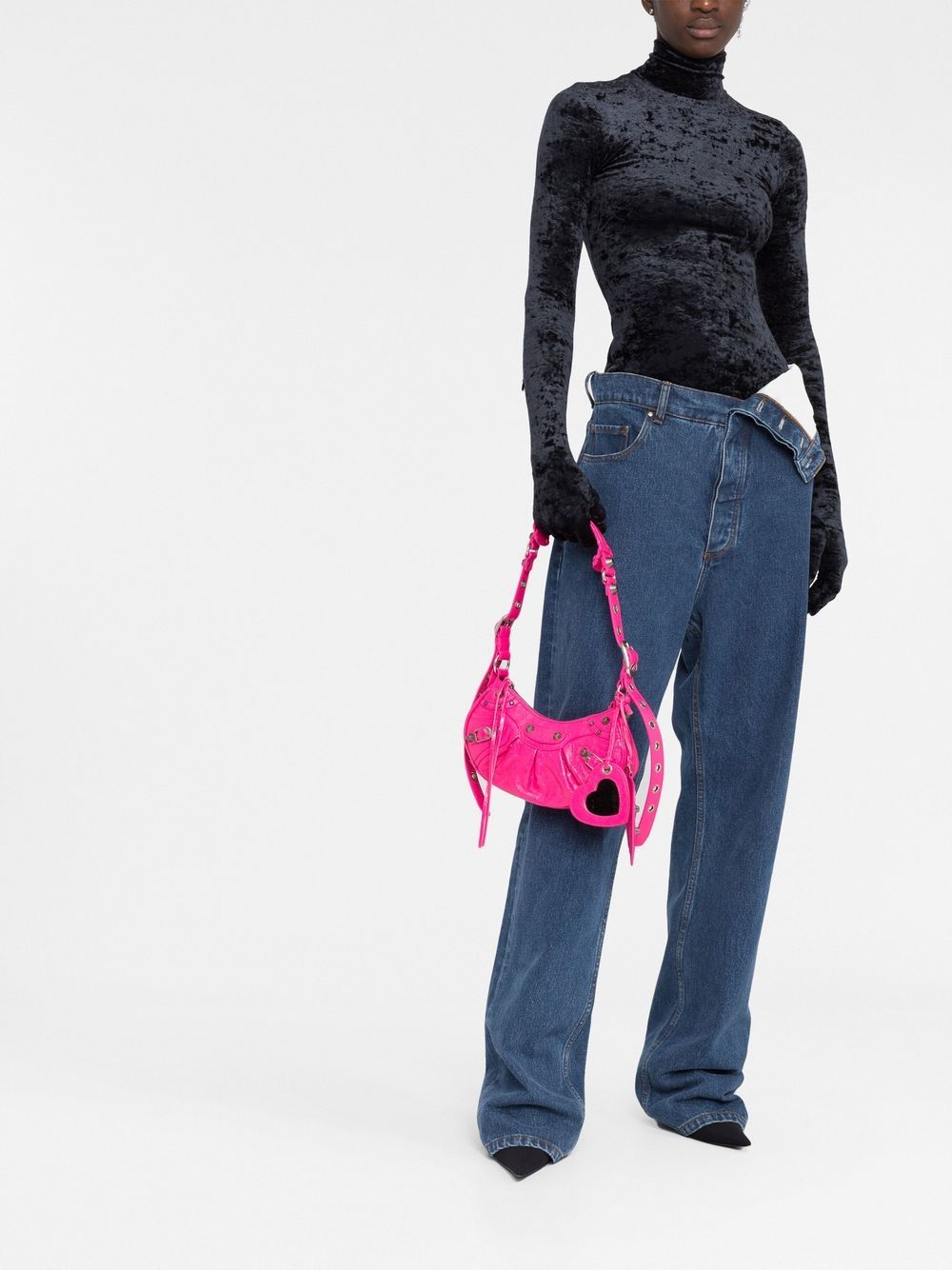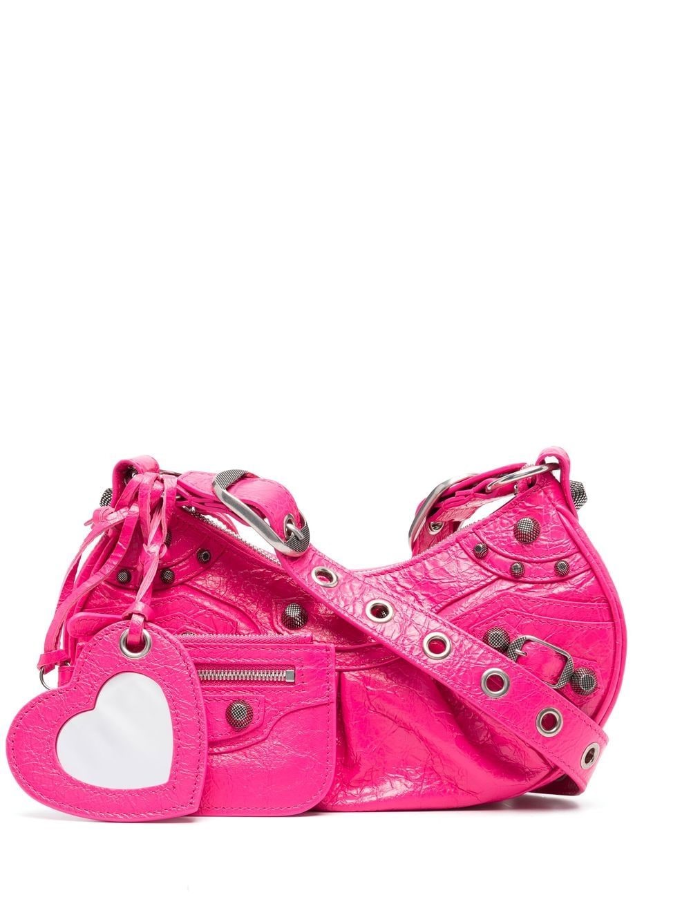 Balenciaga looks to the turn of the millennium for their noughties-inspired Le Cagole shoulder bag. Produced in a cracked shiny hot-pink hue, it is constructed in a hemispherical shape and punctuated with metal studs, whilst a detachable heart-shaped mirror and pouch charm add playfulness to its bold design.