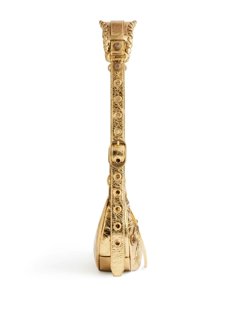 In a lambskin construction, Balenciaga’s XS Le Cagole bag is presented in a gold-tone iteration with a textured high-shine finish. Drawing inspiration from early noughties style, the hemispherical shape is punctuated with metal studs, whilst a detachable heart-shaped mirror and pouch charm add playfulness to its bold design.