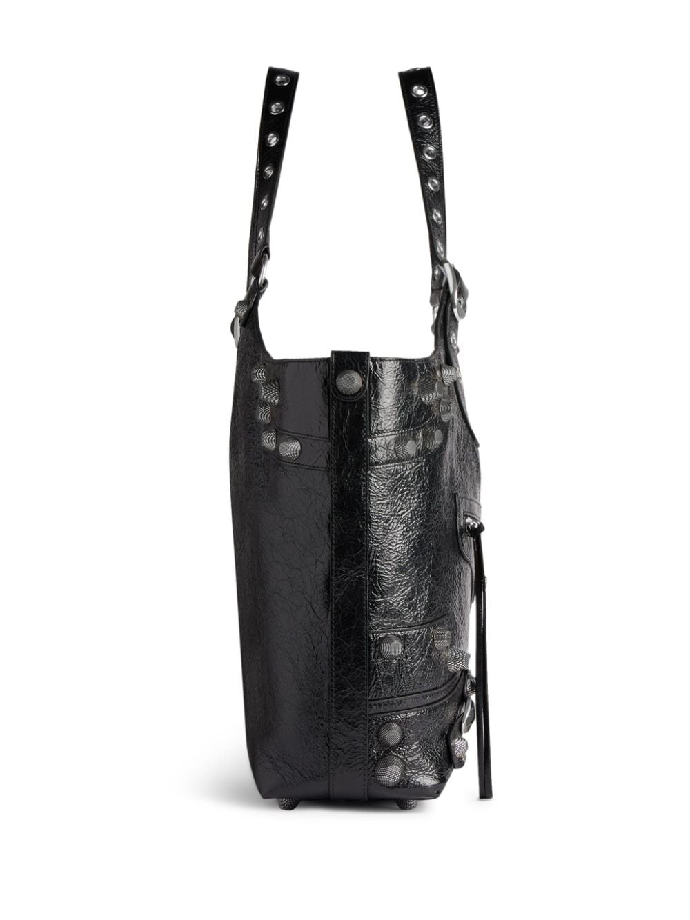 Taking its name from the French stereotype describing a cool and confident girl from Marseille, Balenciaga’s Le Cagole bag collection adopts the maximalist aesthetic of the character in its bold design. This medium black tote iteration is accented with studs and eyelets that trace the distressed leather construction, It comes with a handy front zip pocket and adjustable strap.