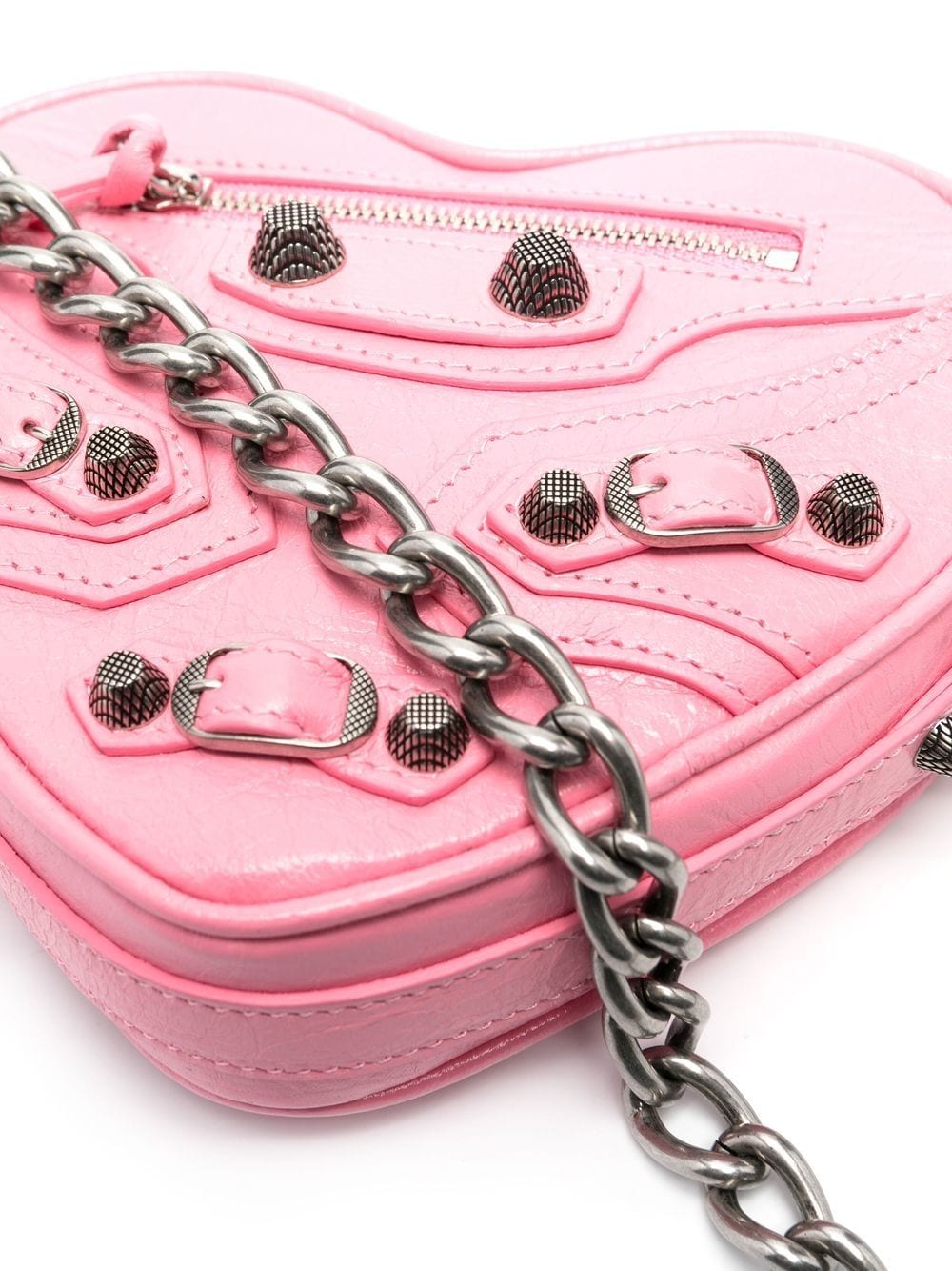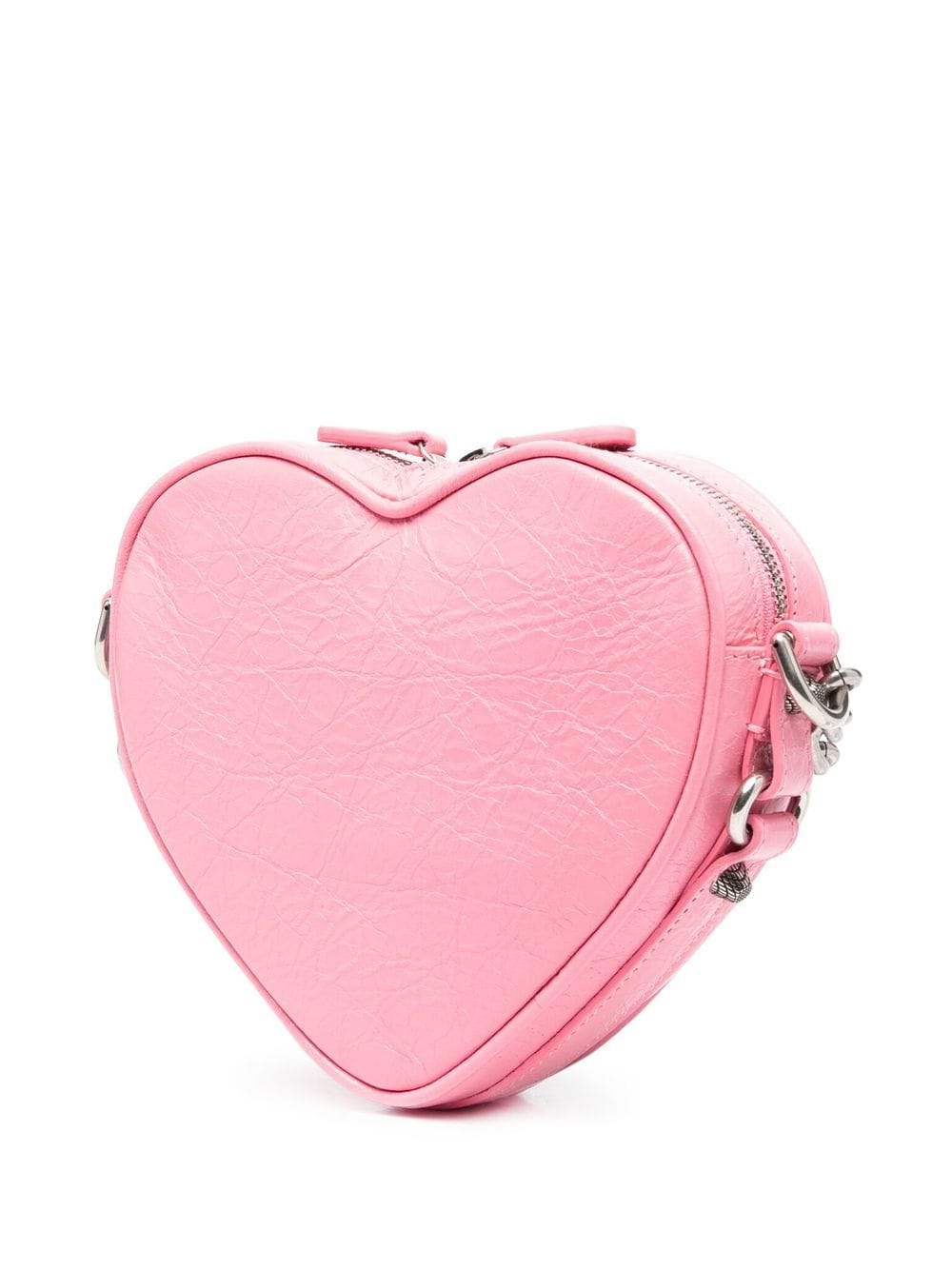 mini Le Cagole Heart leather crossbody bag from BALENCIAGA featuring rose pink, calf leather, crease effect, decorative buckle detail, stud design, silver-tone hardware, two-way zip fastening, detachable chain-link shoulder strap, front zip fastening pockets, main compartment, internal card slots and internal logo stamp. Conscious: We’ve partnered with Good On You – an ethical agency that rates how sustainably brands perform. This item comes from a brand that performs well in relation to their impact on the planet..